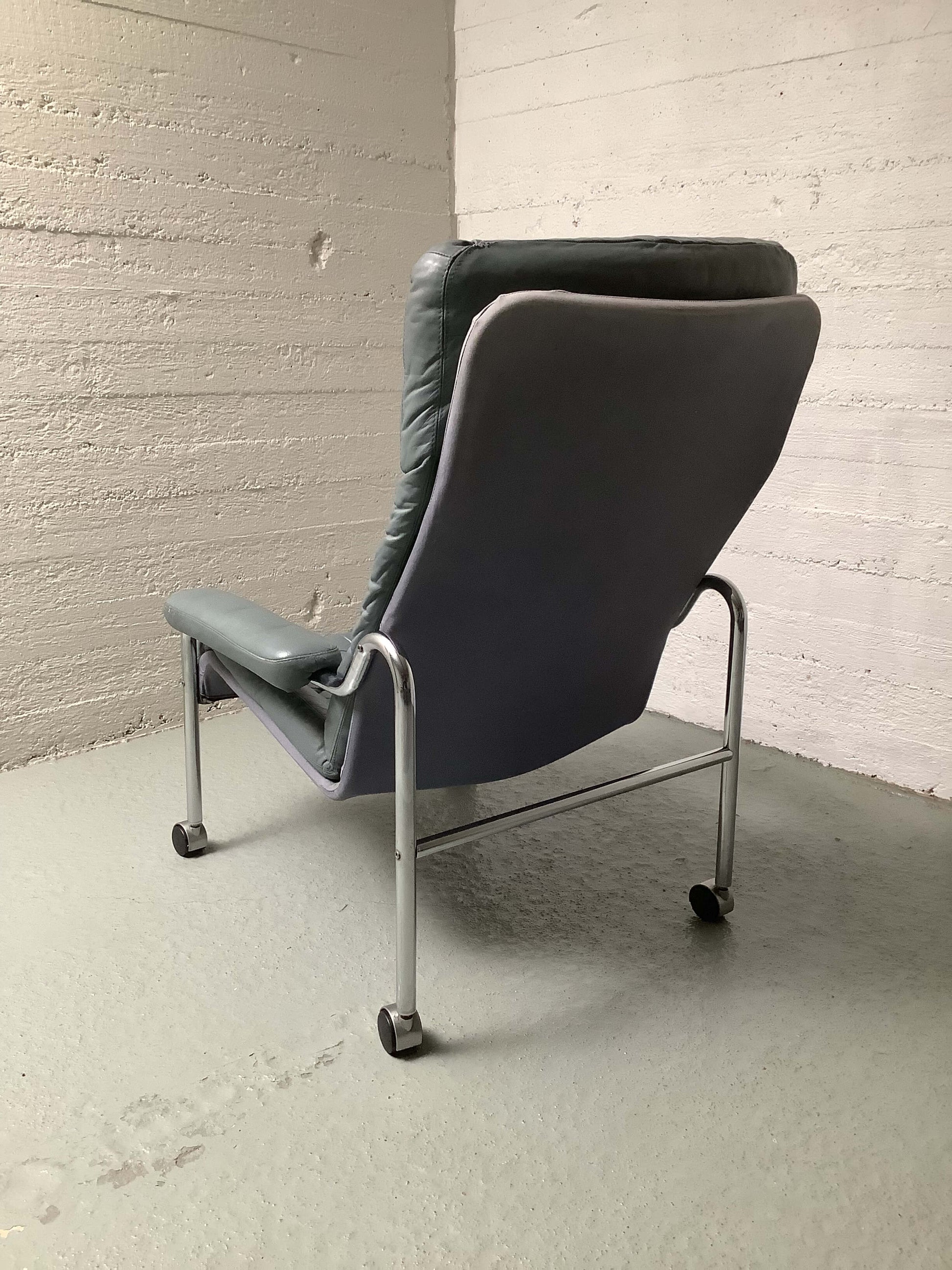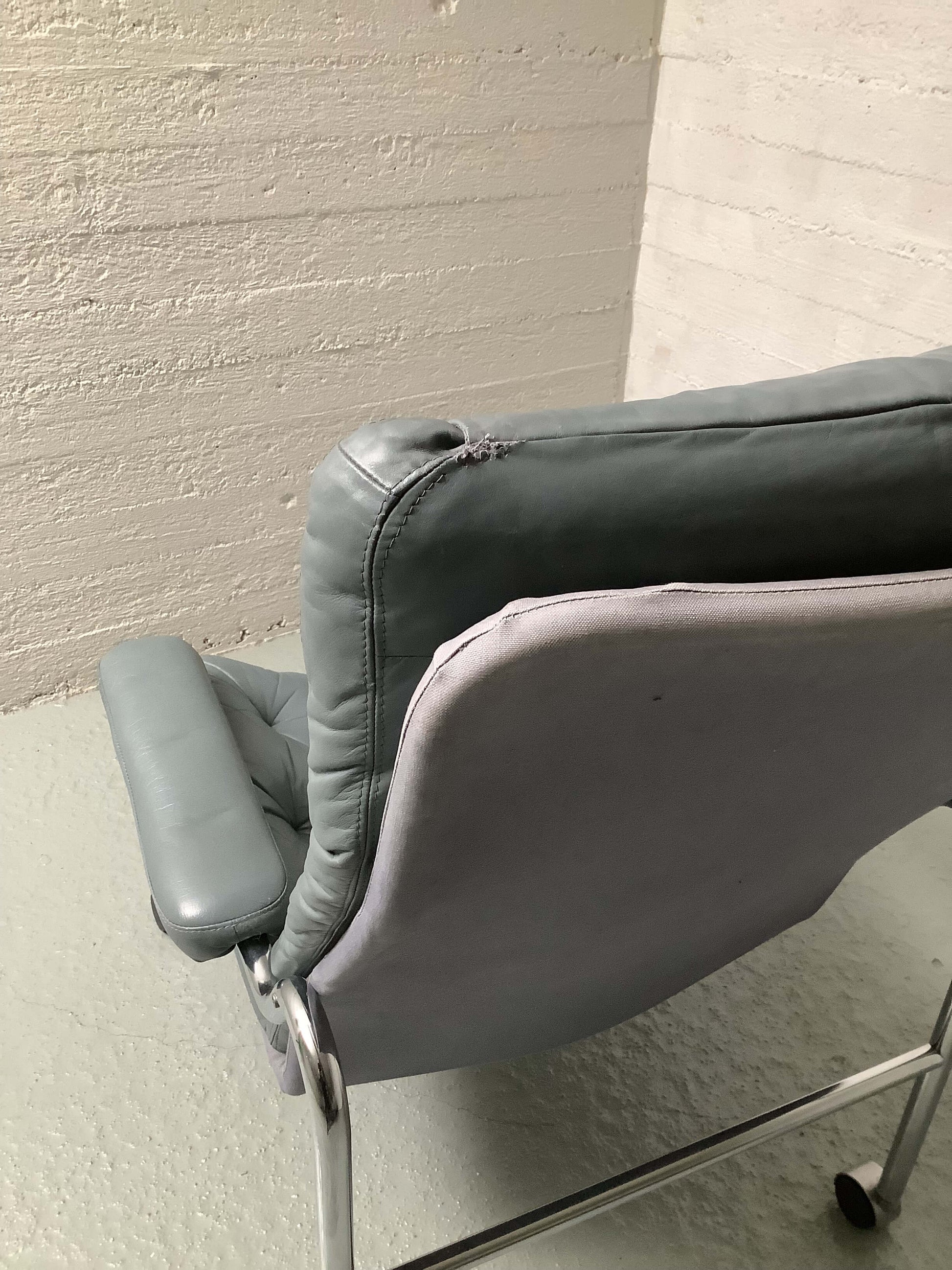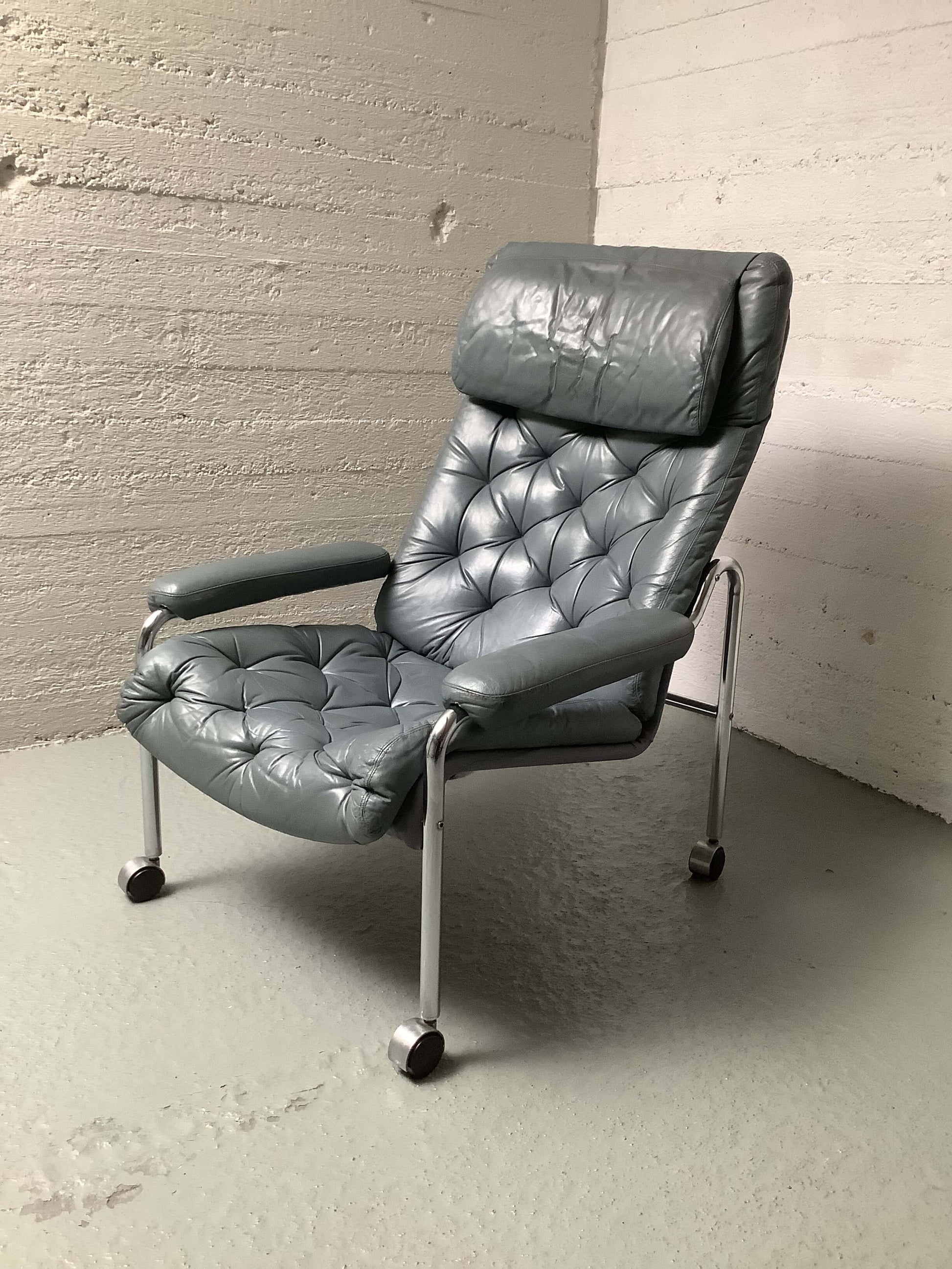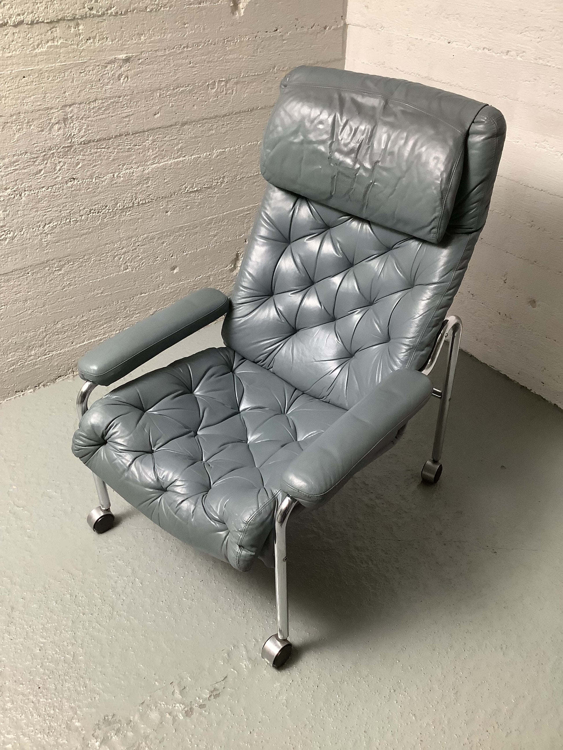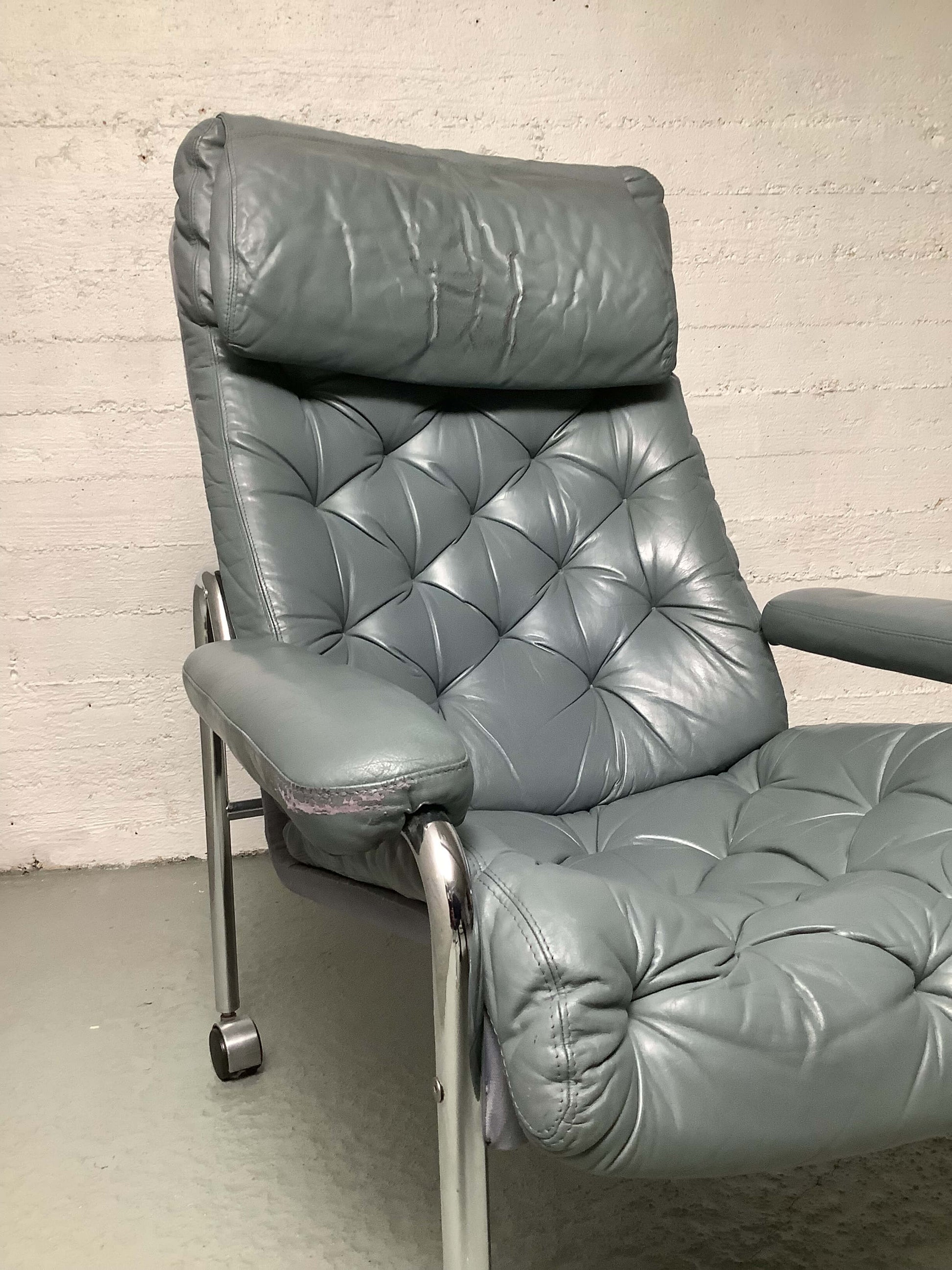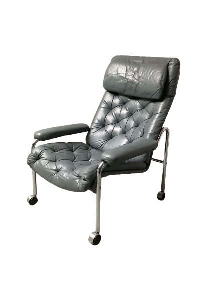 Tyylikäs ja ajaton BJ Dahlqvistin suunnittelema lepotuoli, joka huokuu skandinaavista muotoilua ja 60-/70-luvun tunnelmaa. Tuolissa on elegantti, kromattu putkirunko, joka antaa tuolille kevyen mutta jämäkän ilmeen. Istuinosa on verhoiltu harmaalla nahalla, joka tekee tuolista sekä mukavan että näyttävän. Tuolin selkäpuoli kangasta.