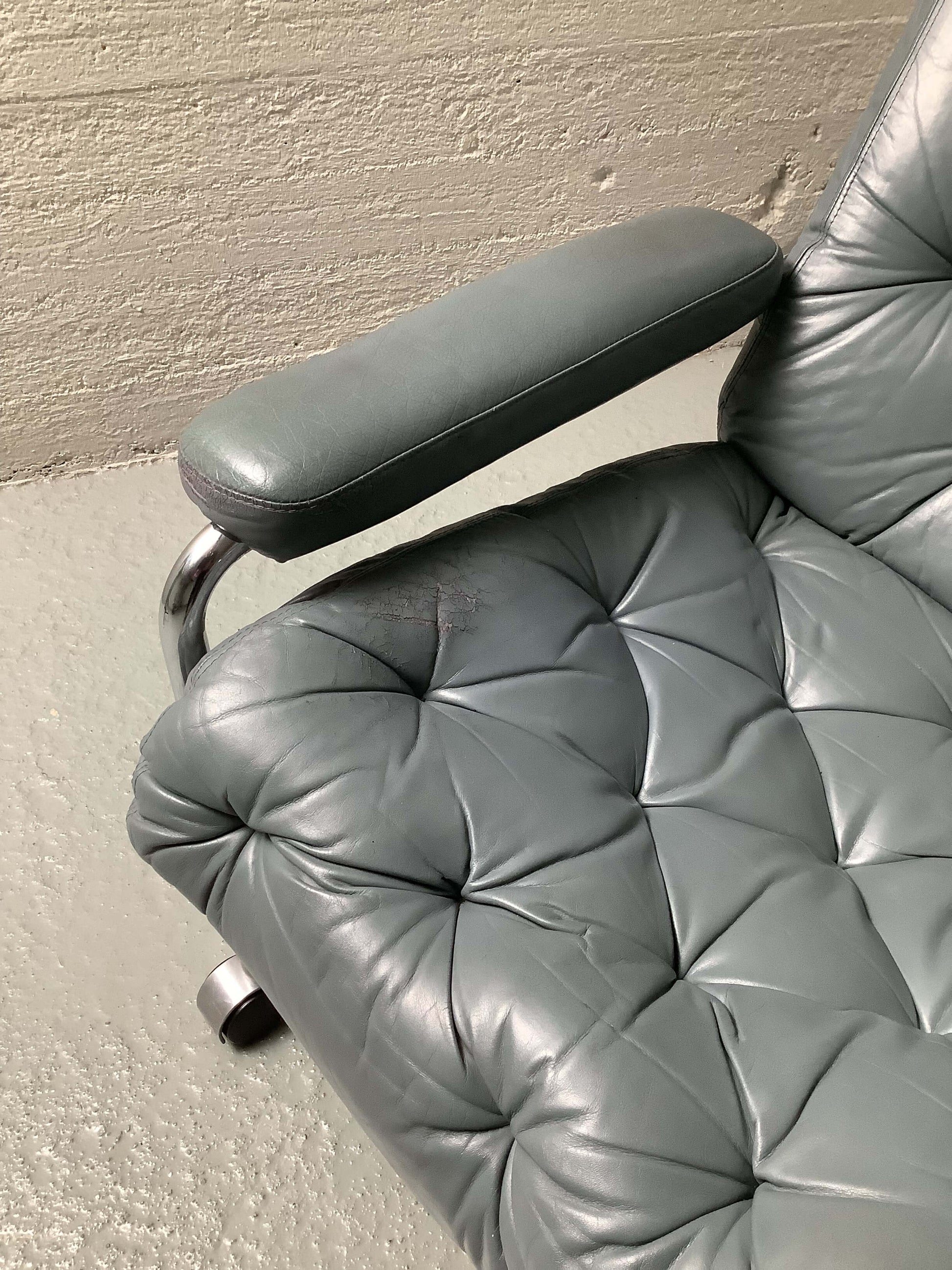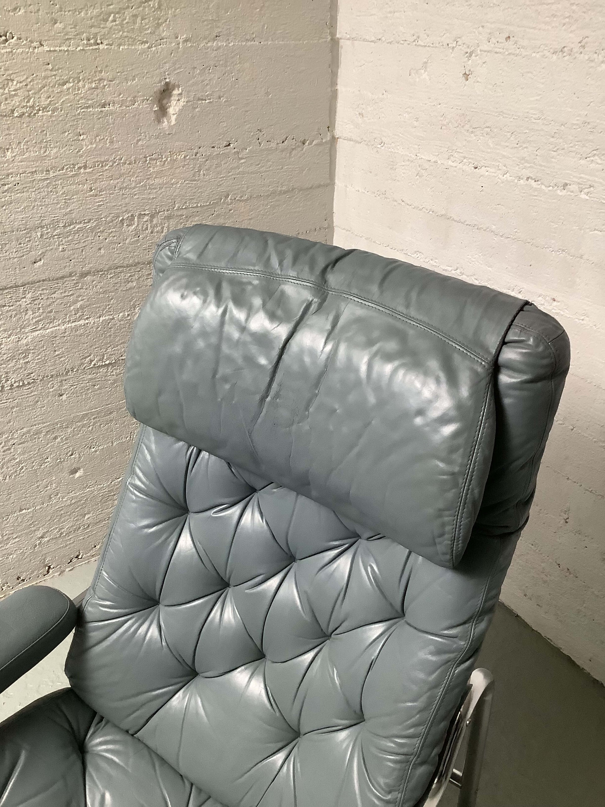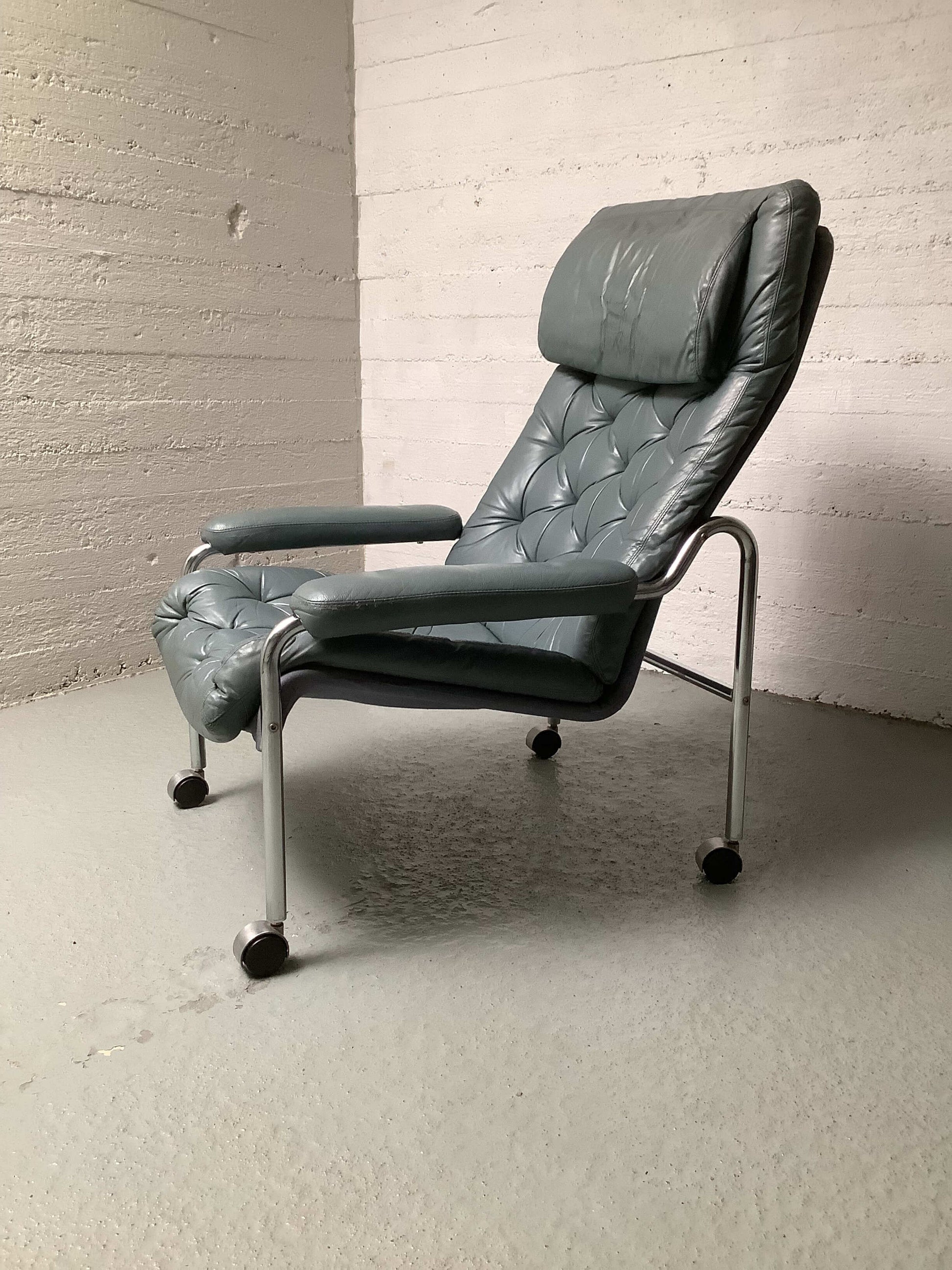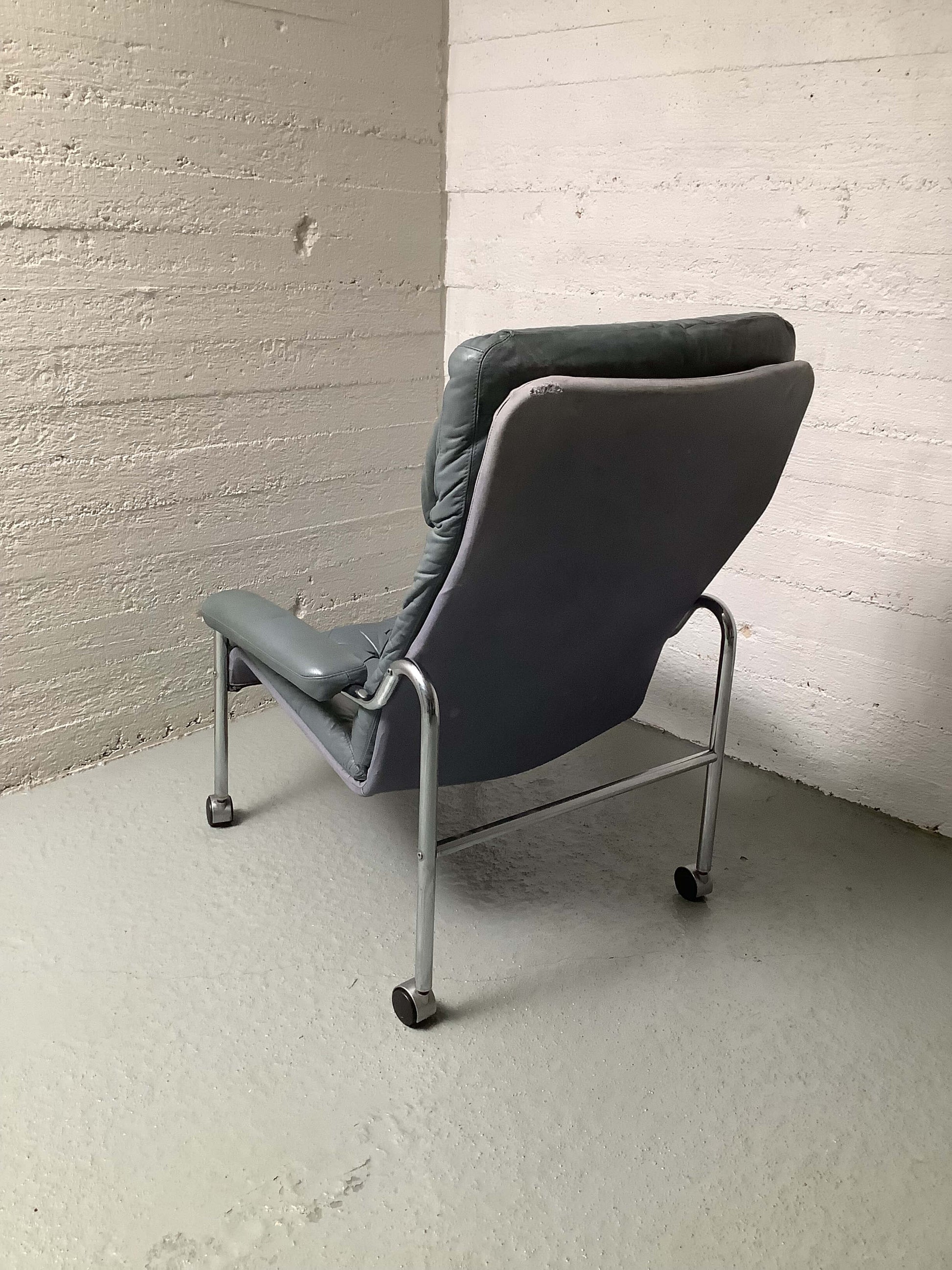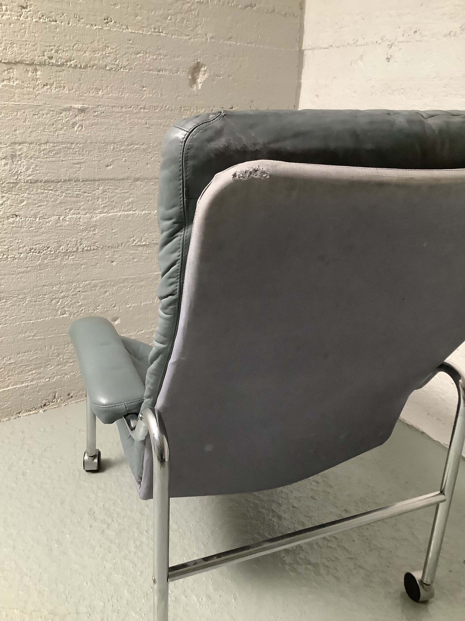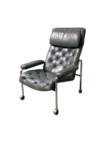 Tyylikäs ja ajaton BJ Dahlqvistin suunnittelema lepotuoli, joka huokuu skandinaavista muotoilua ja 60-/70-luvun tunnelmaa. Tuolissa on elegantti, kromattu putkirunko, joka antaa tuolille kevyen mutta jämäkän ilmeen. Istuinosa on verhoiltu harmaalla nahalla, joka tekee tuolista sekä mukavan että näyttävän. Tuolin selkäpuoli kangasta.