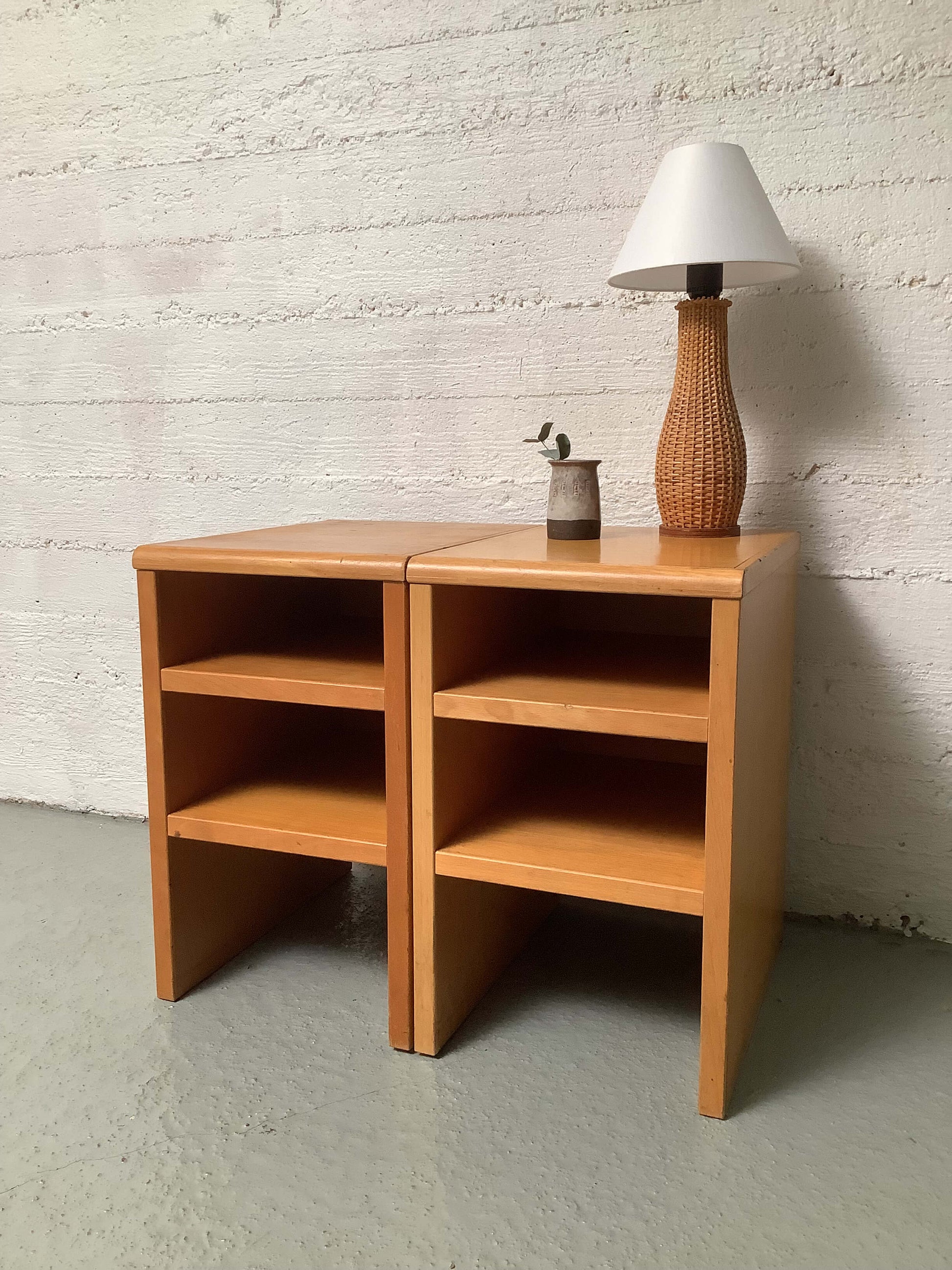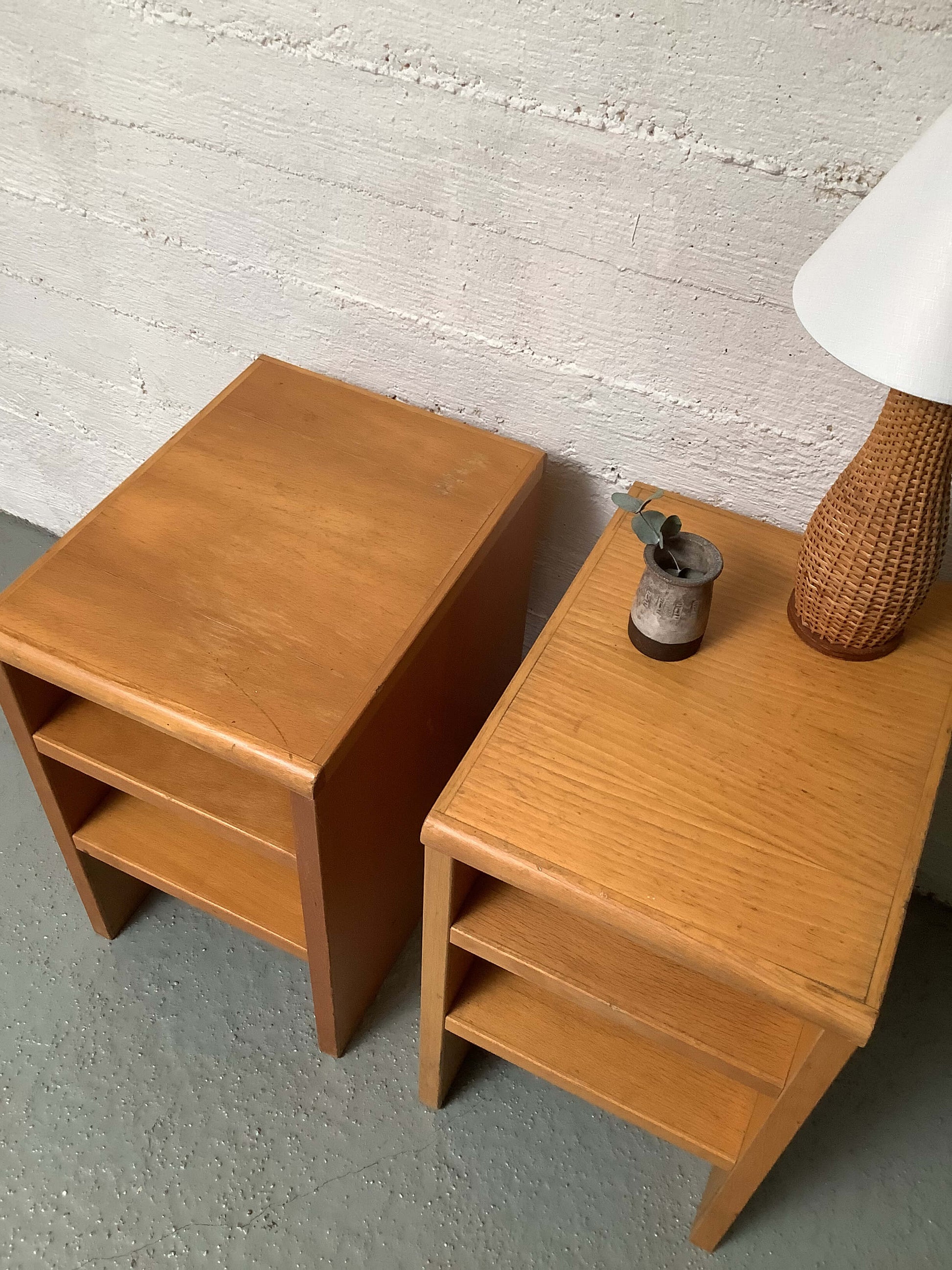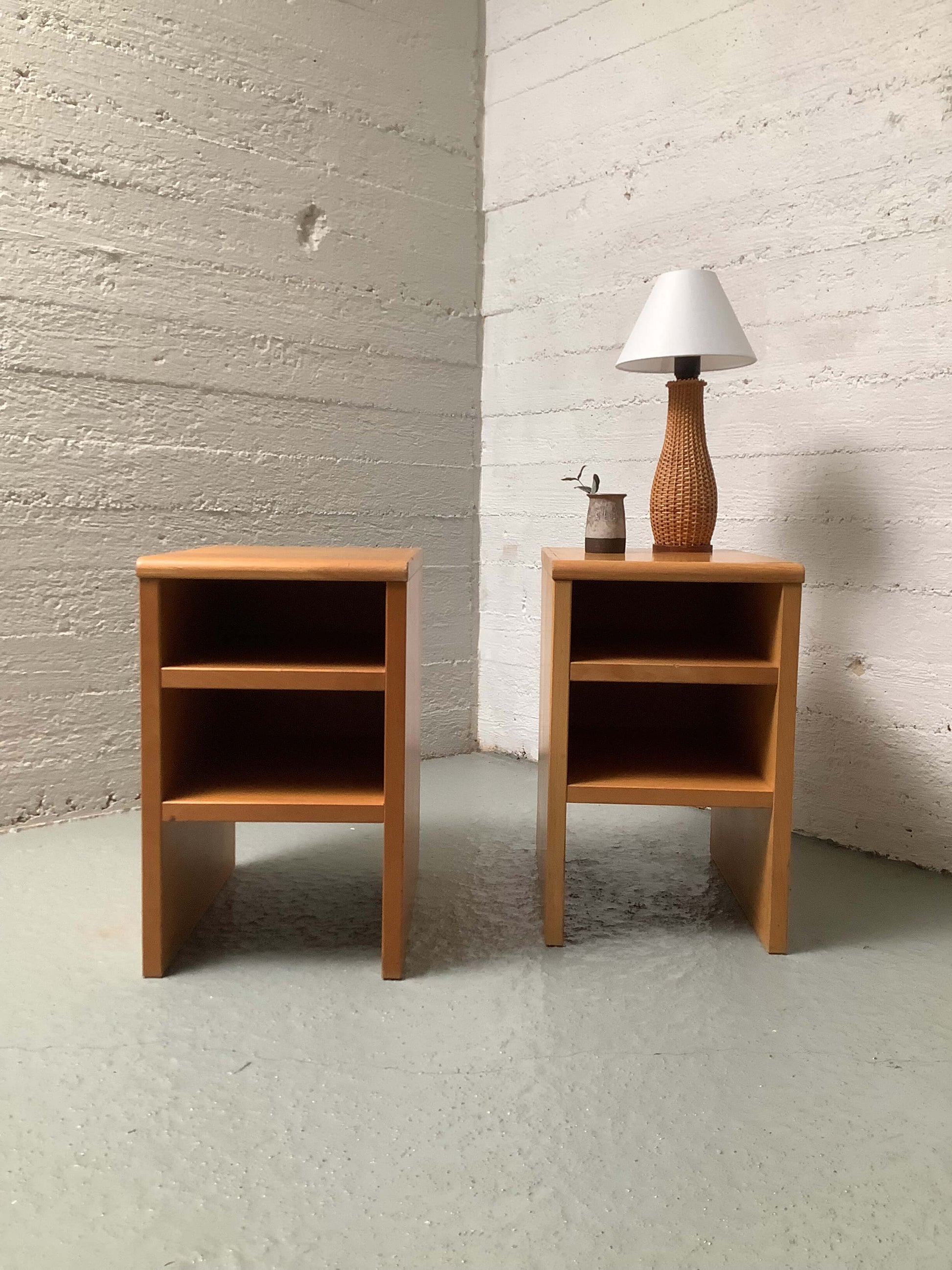Funkkistyyliset sivupöydät 60/70-luku. Tukevarakenteiset, ajanmukaista kulumaa.
