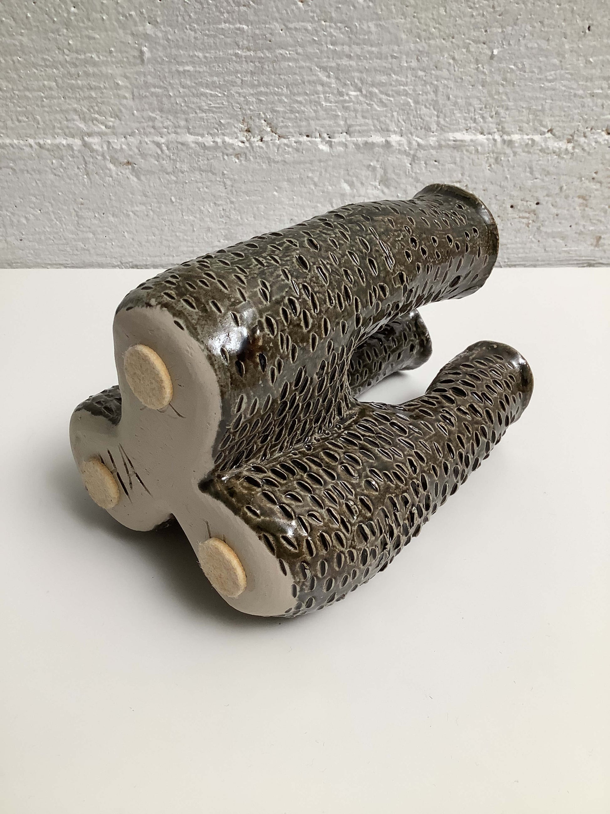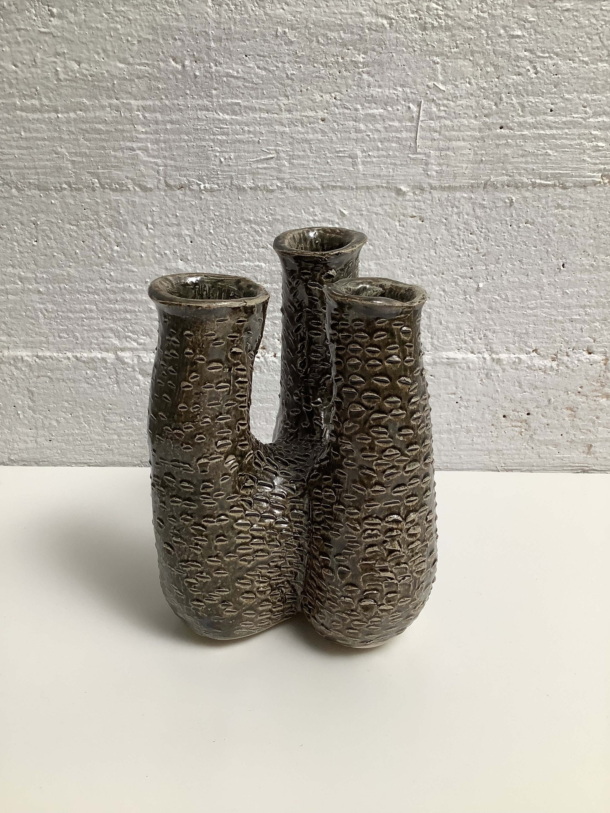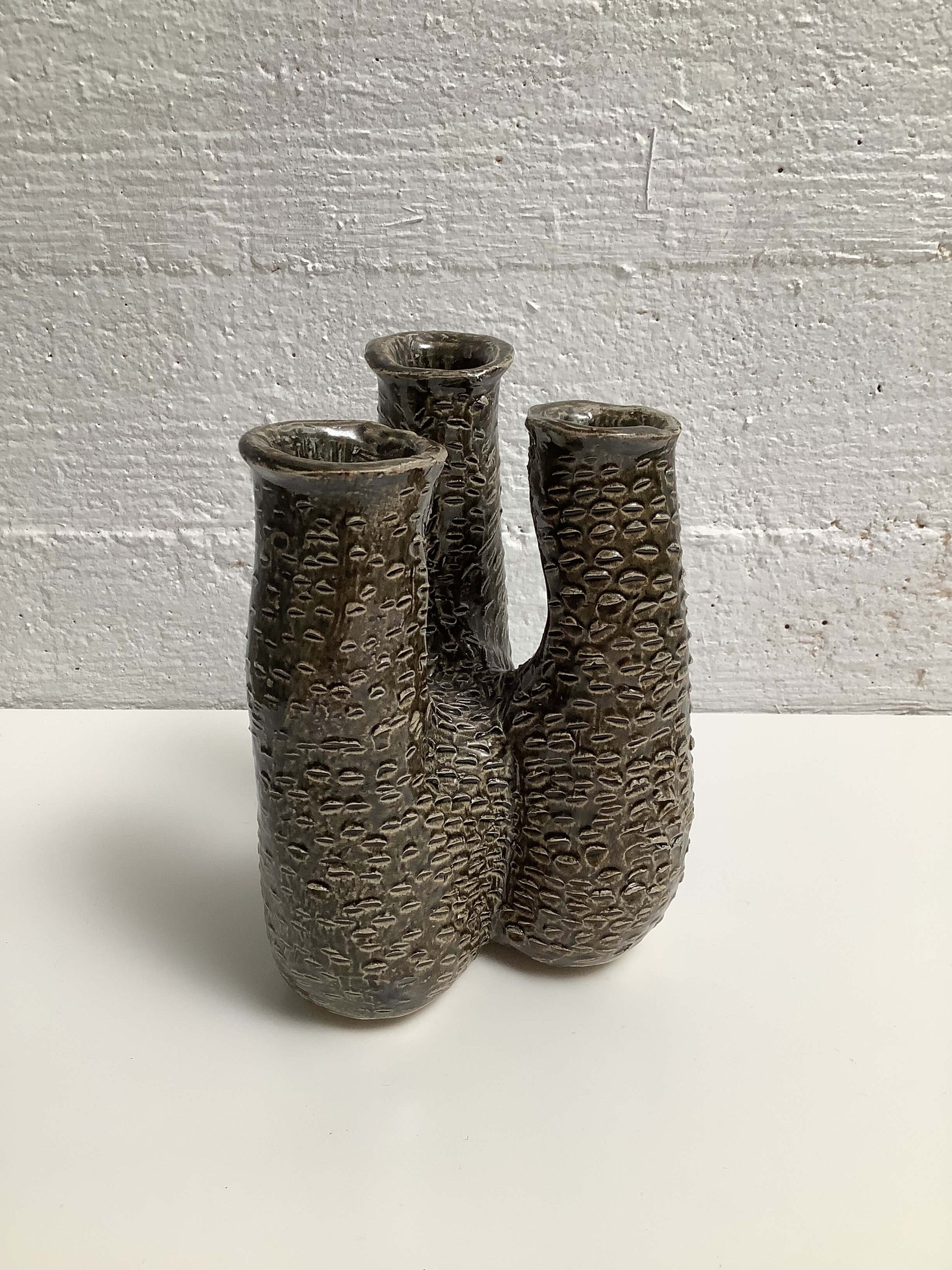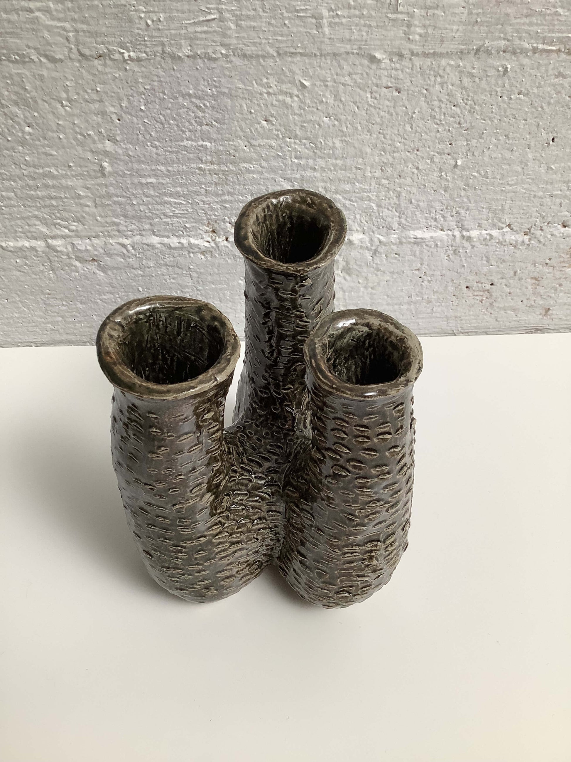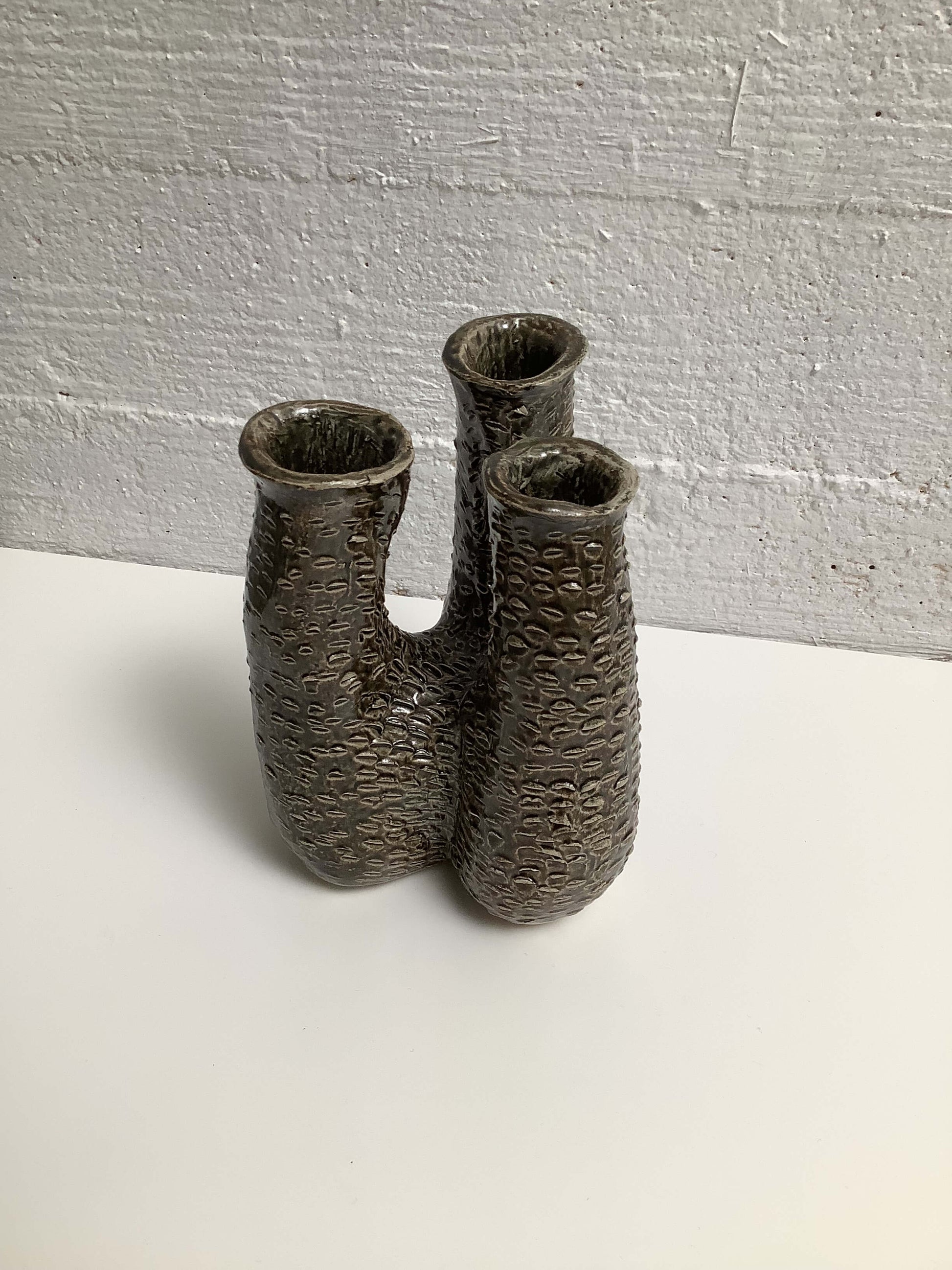 Hauskan mallinen keraaminen maljakko, kolmelle kukalle.