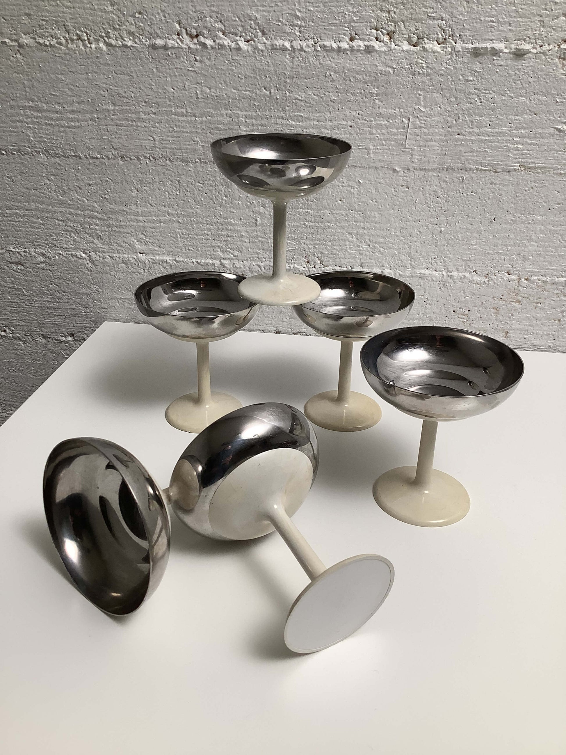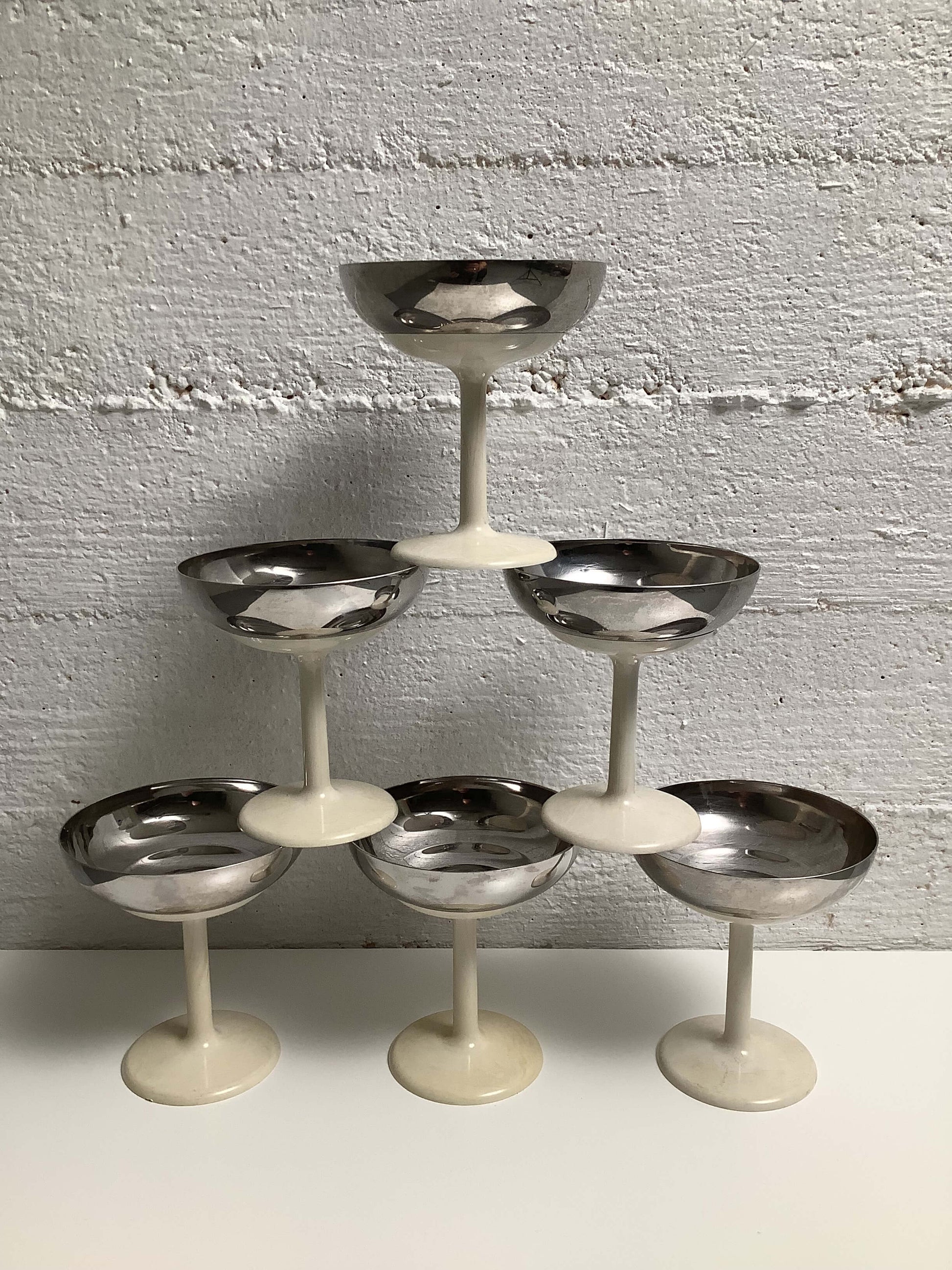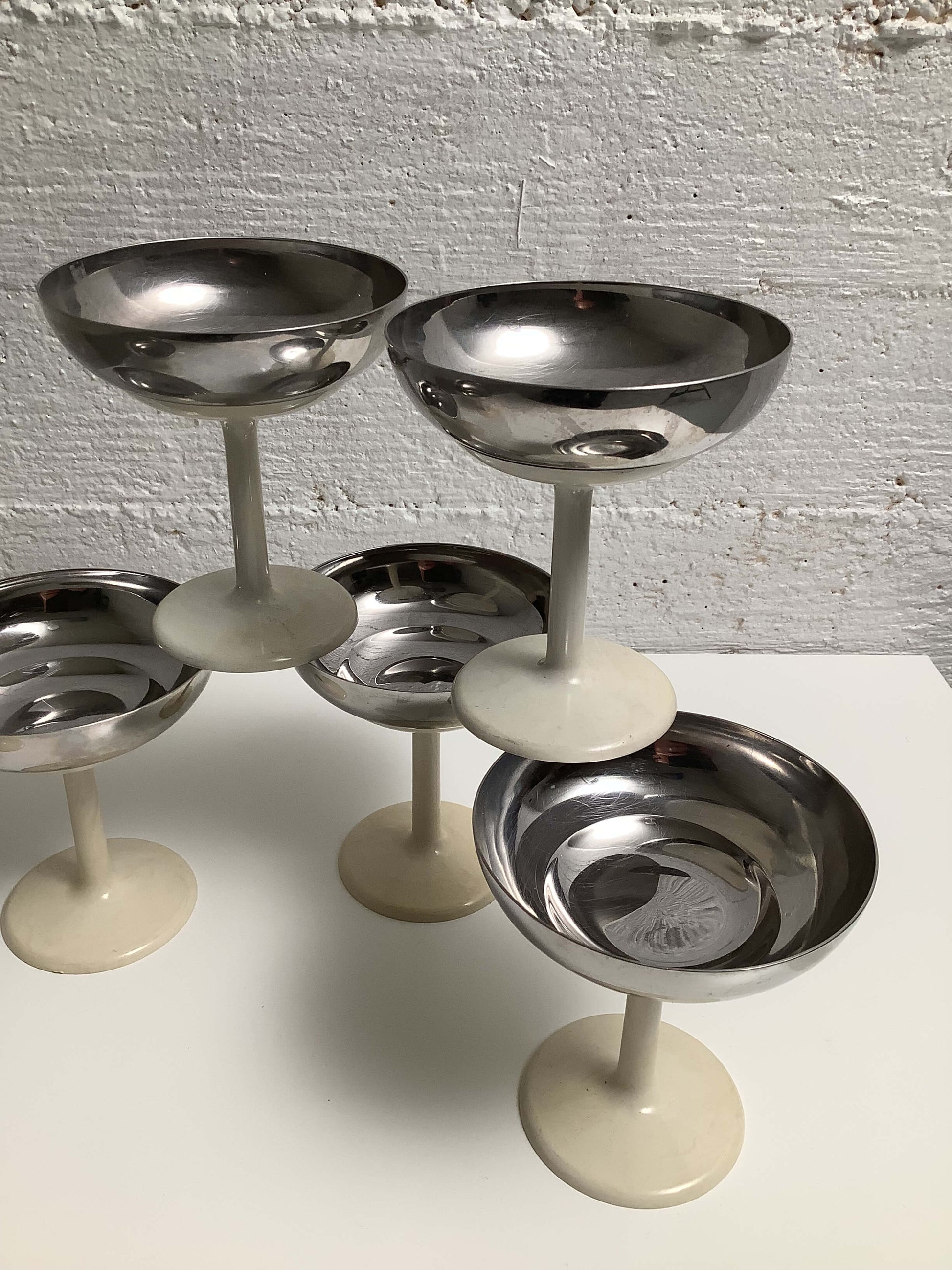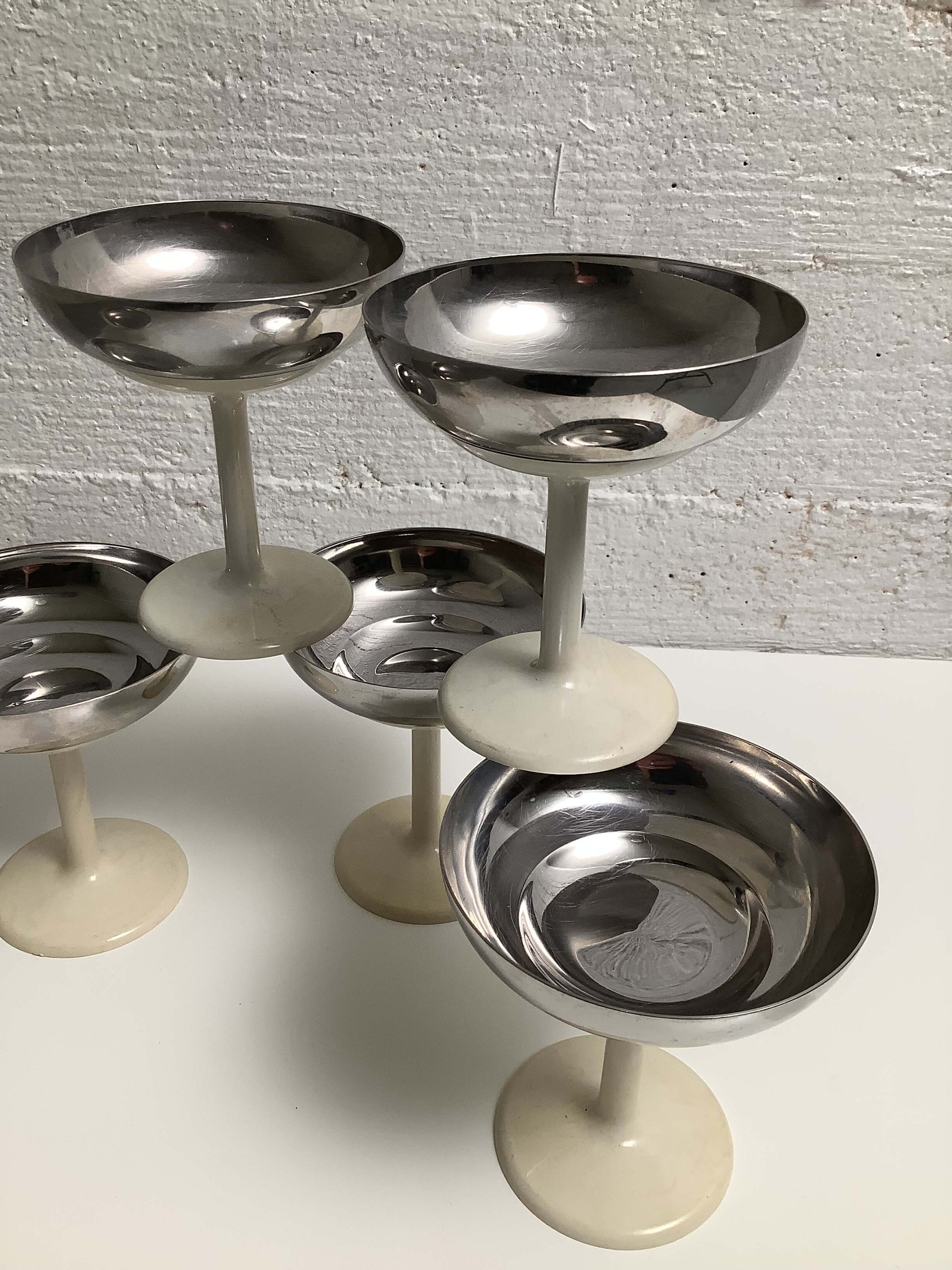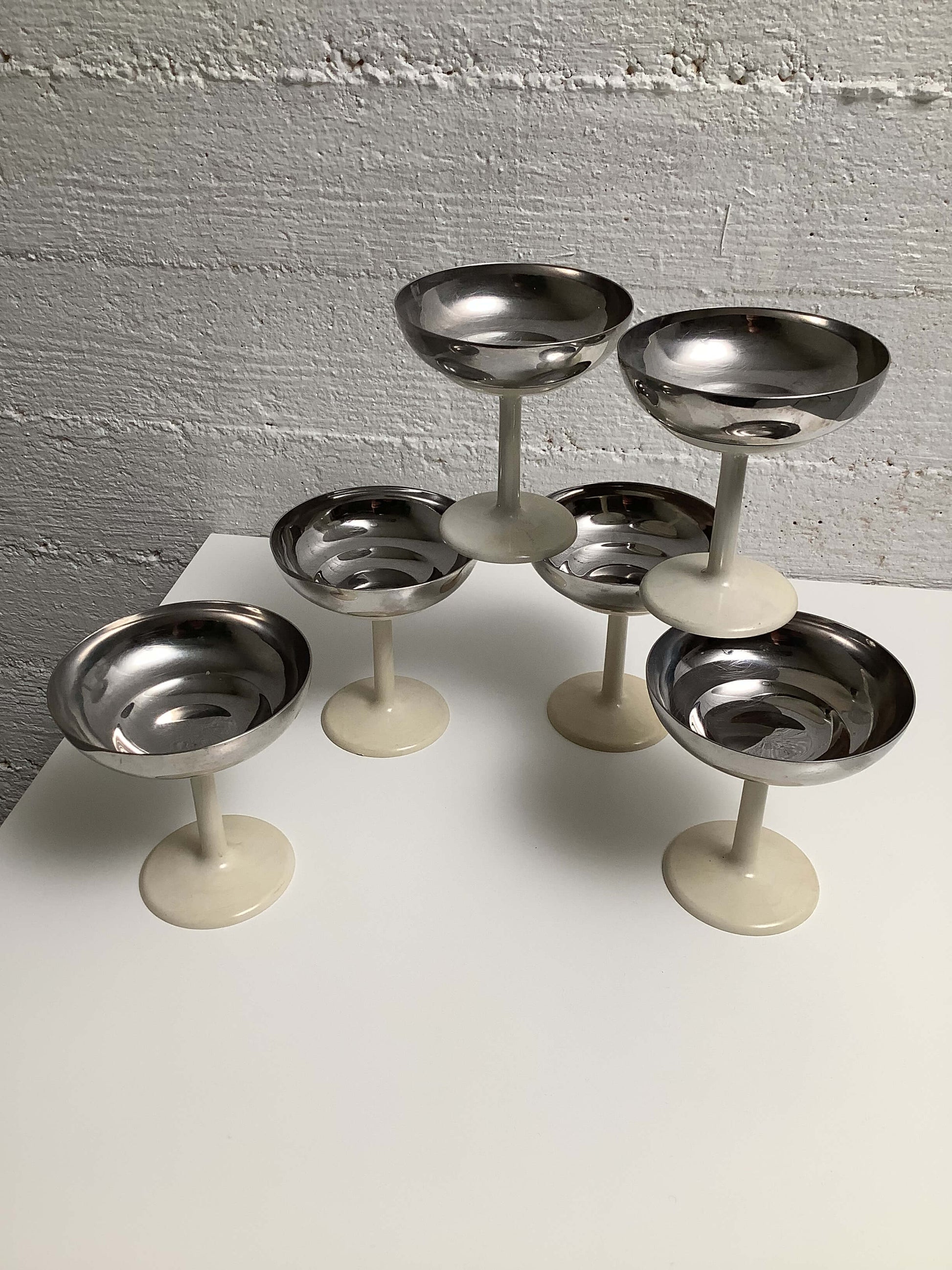 Jätski kulhot 6 kpl, 60/70-luku. Ruostumatonta terästä kulho-osa jalka muovia.