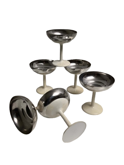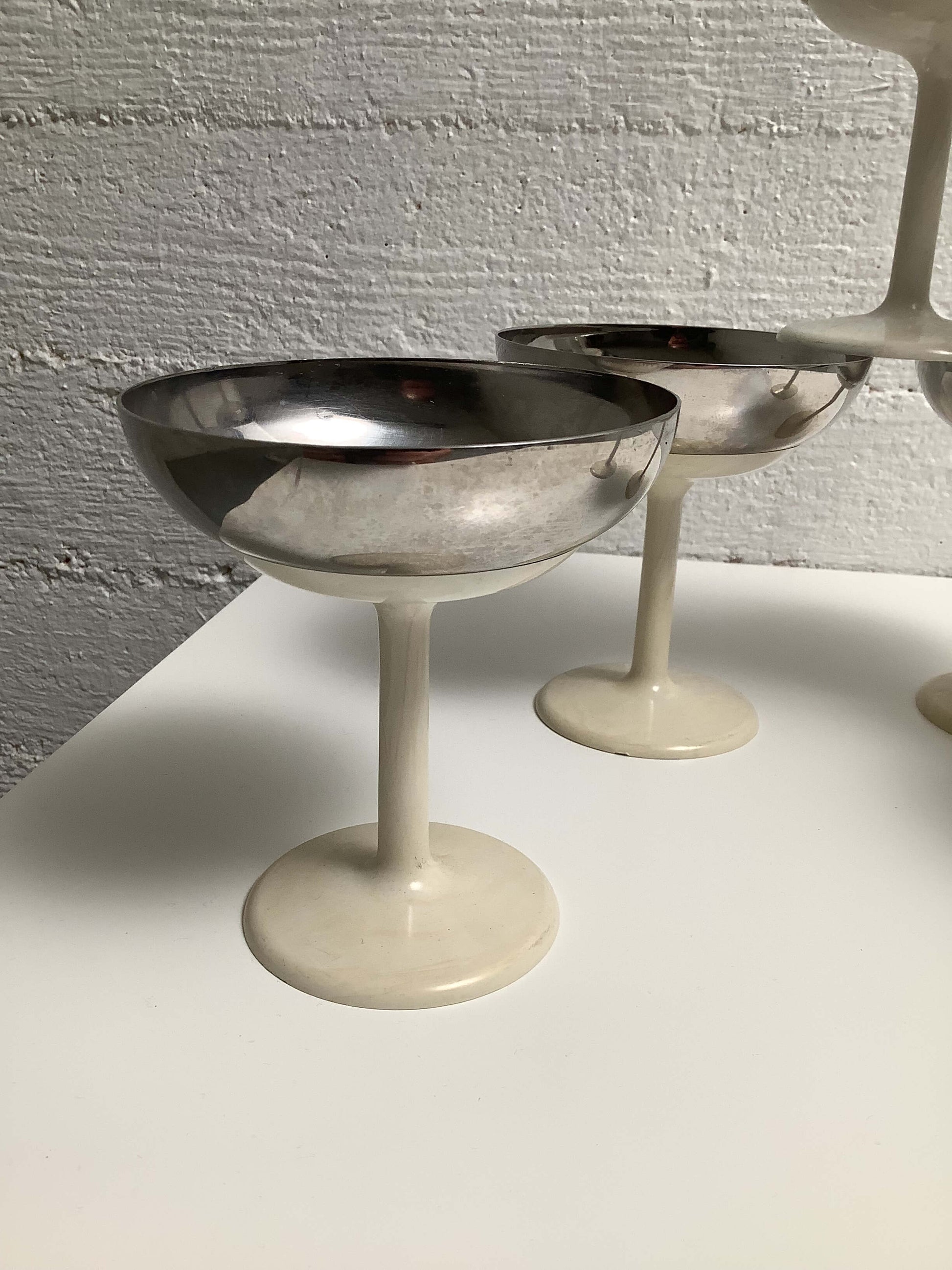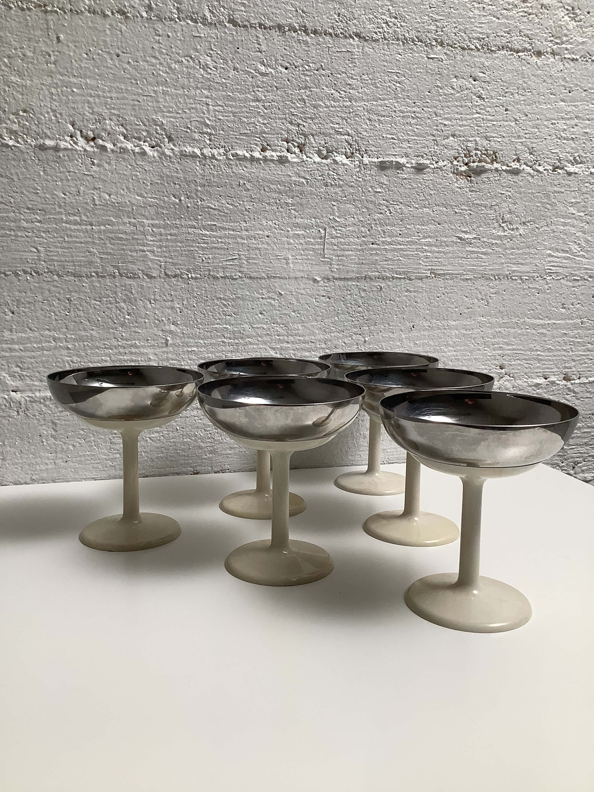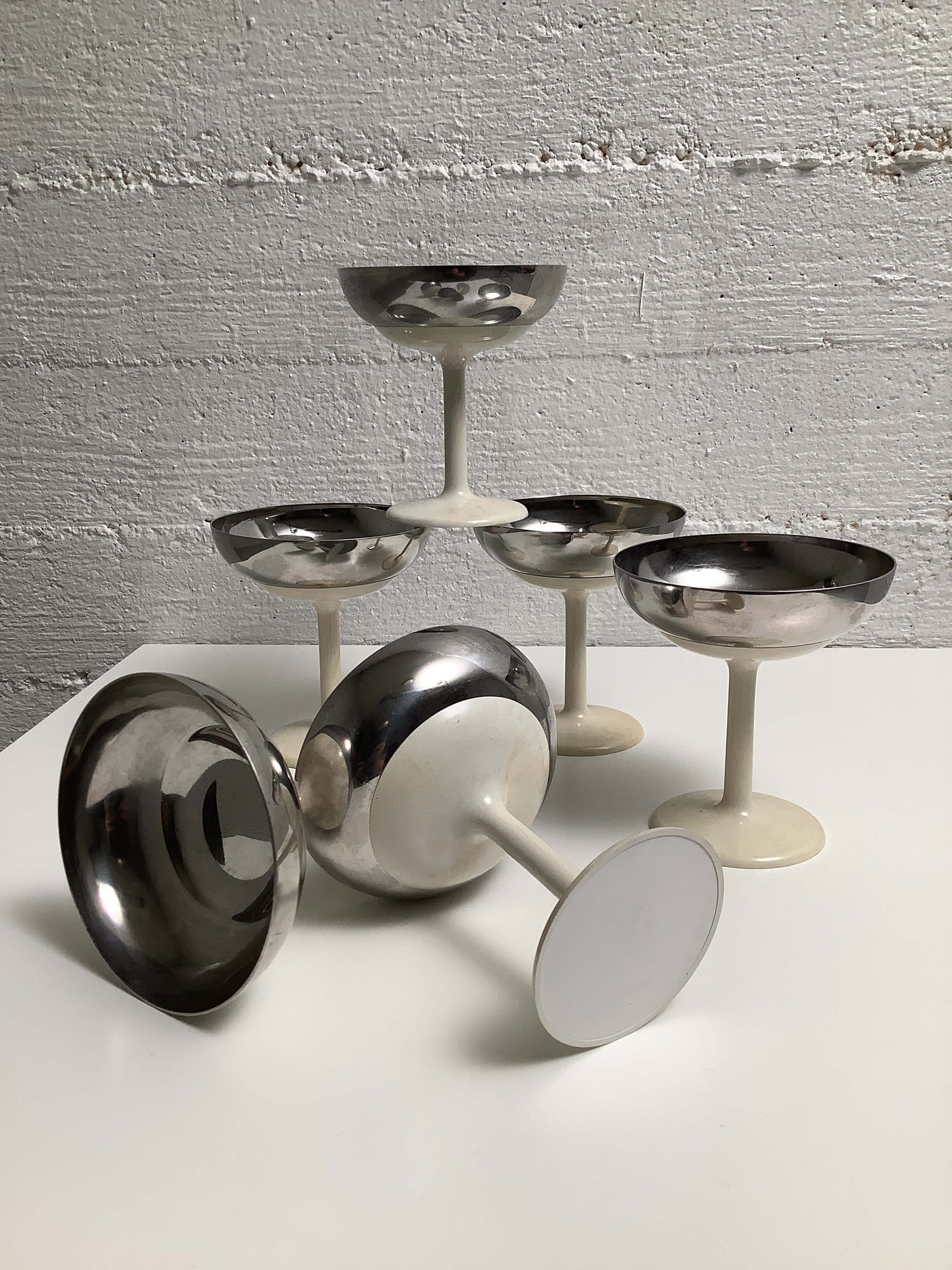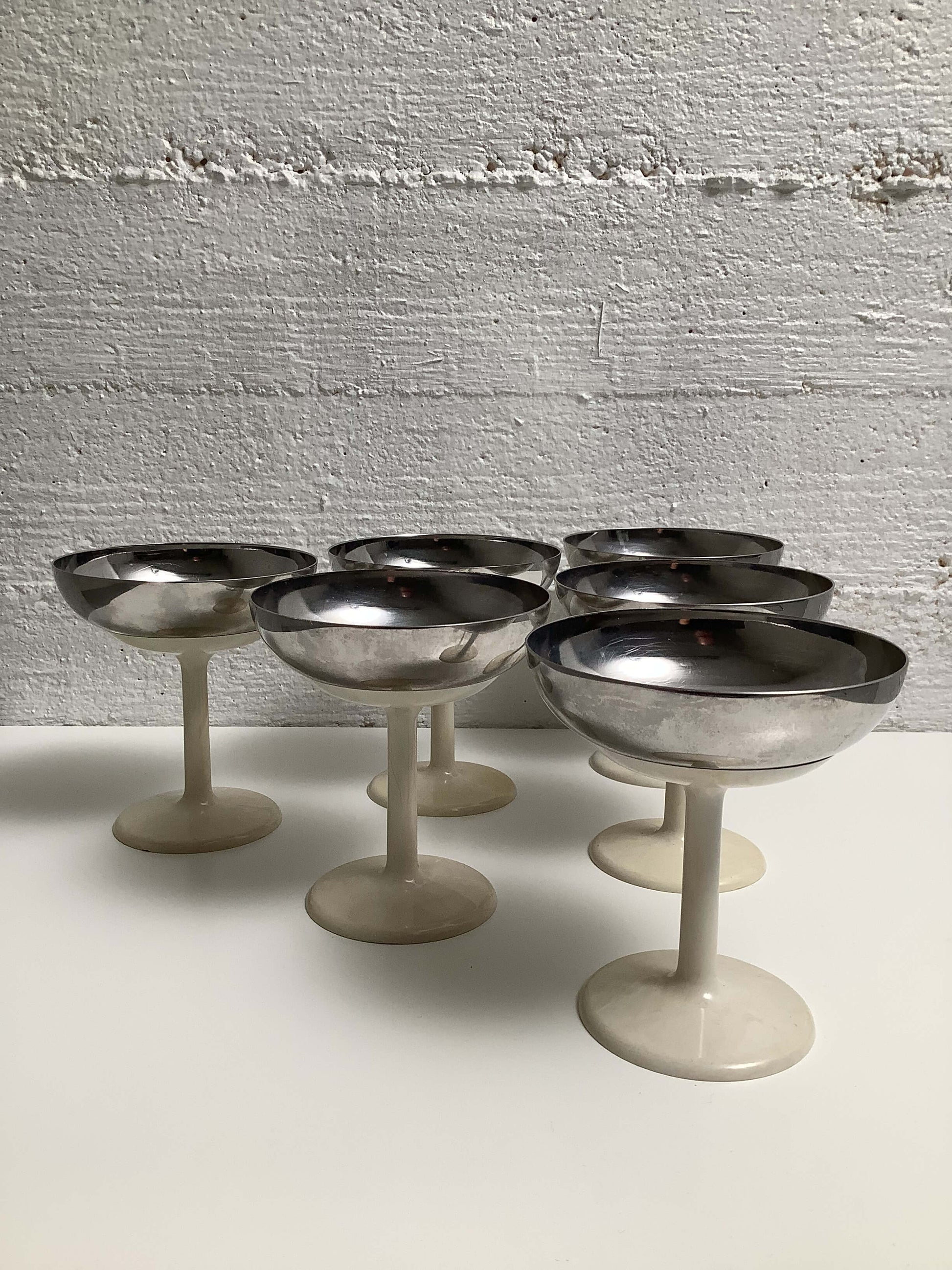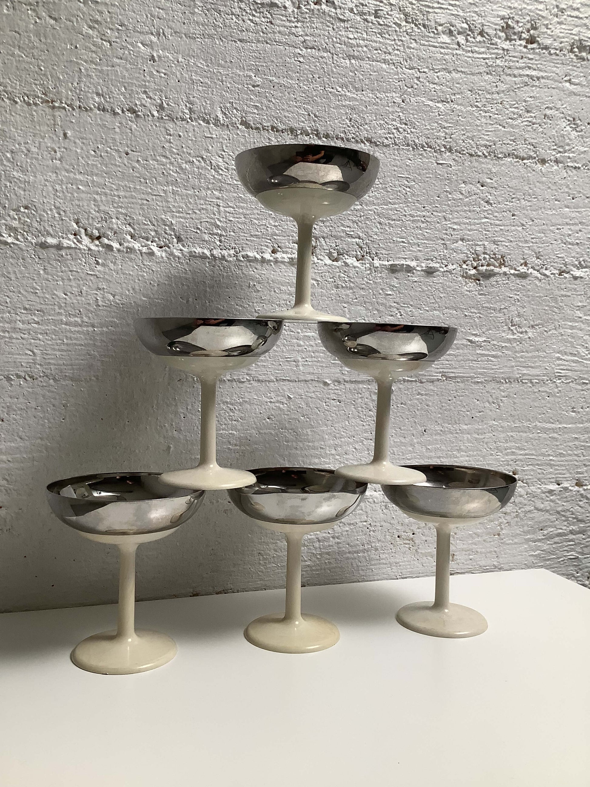 Jätski kulhot 6 kpl, 60/70-luku. Ruostumatonta terästä kulho-osa jalka muovia.