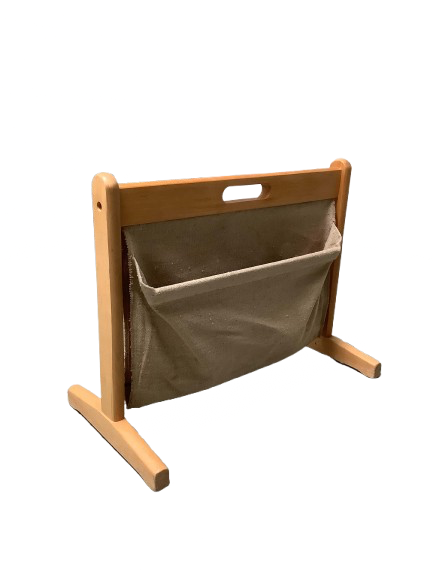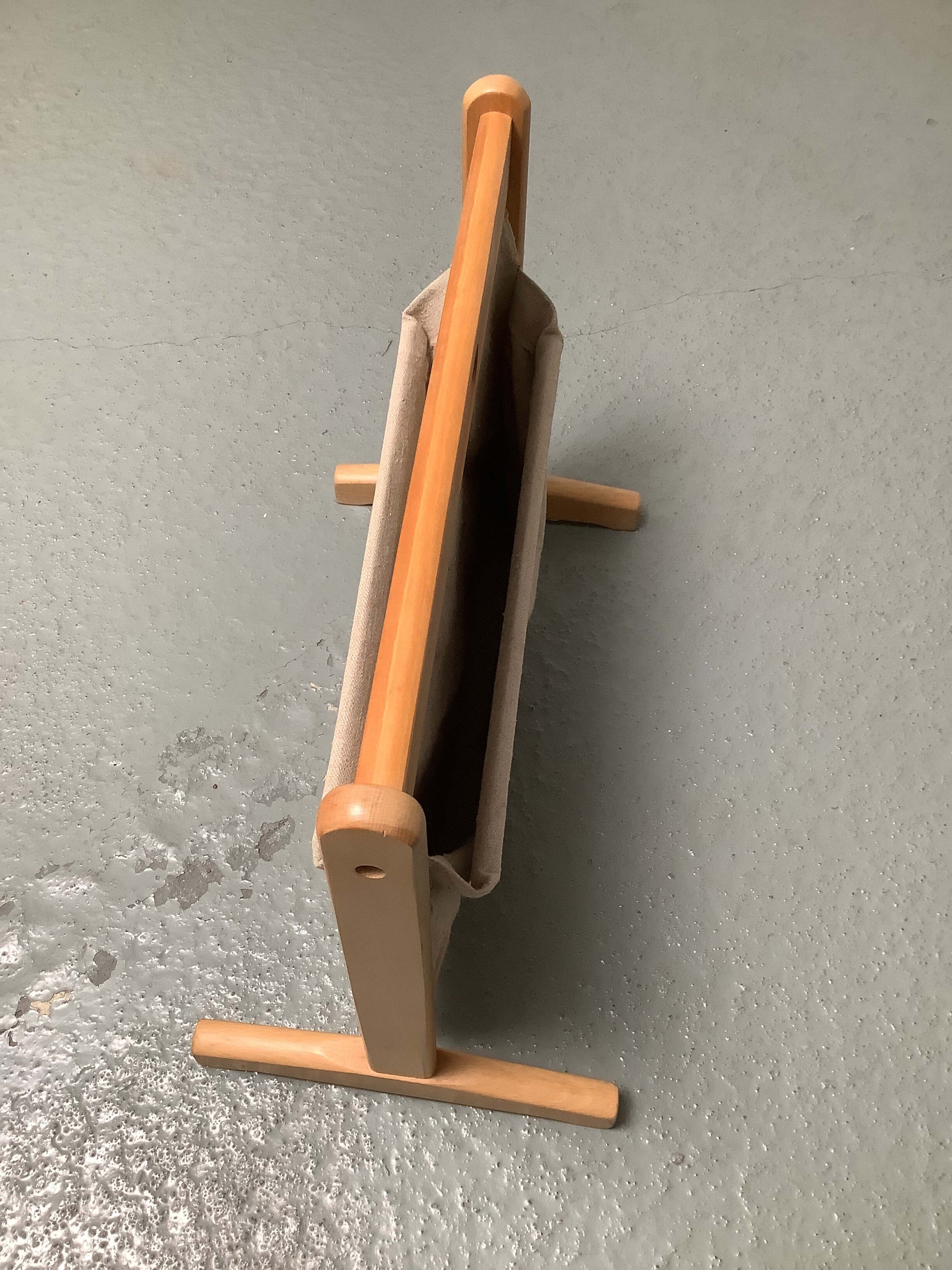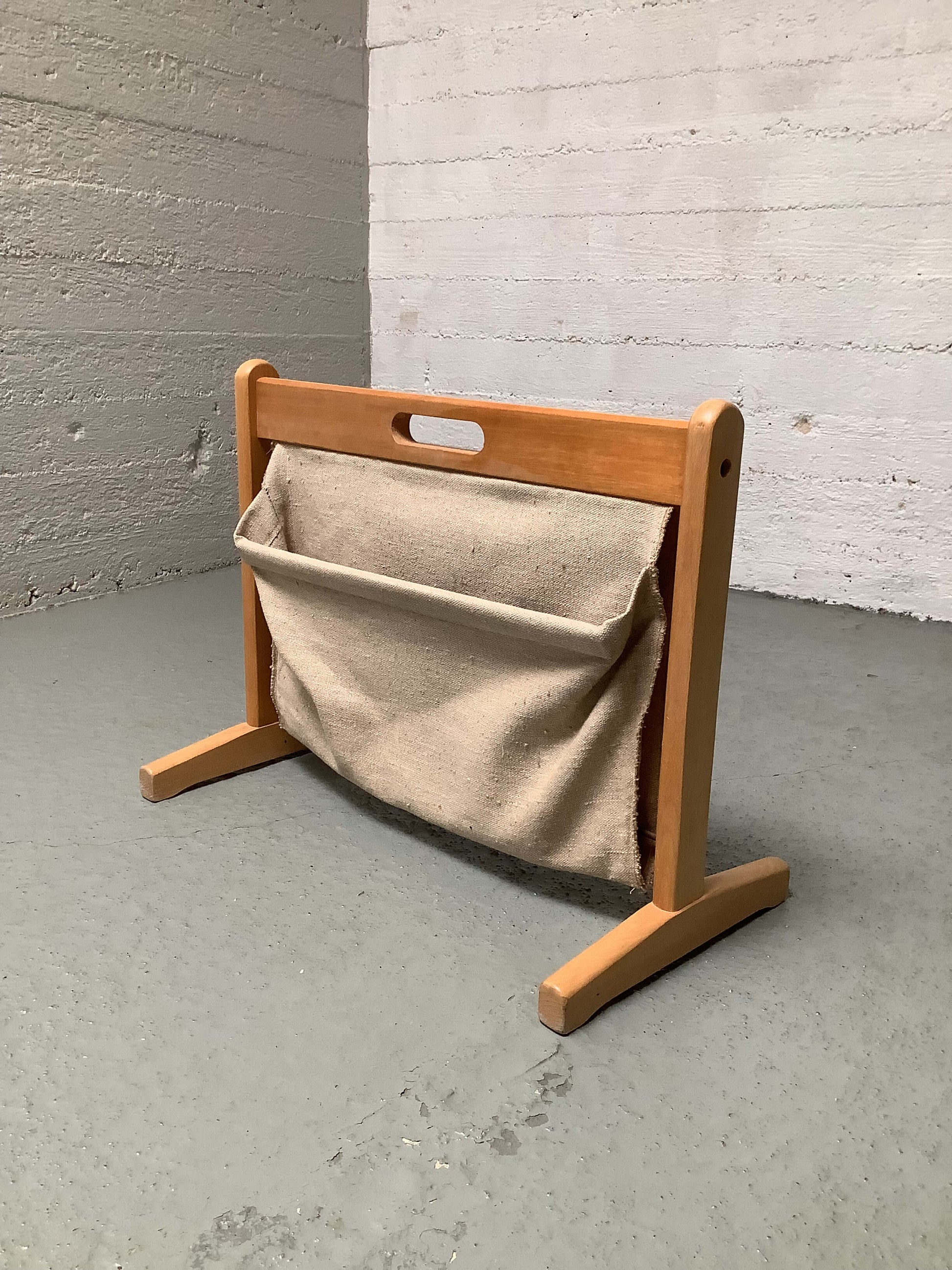 Tanskalainen Furbo lehtiteline. Lehtitasku juuttikangasta, runko tammea. 60-luku.