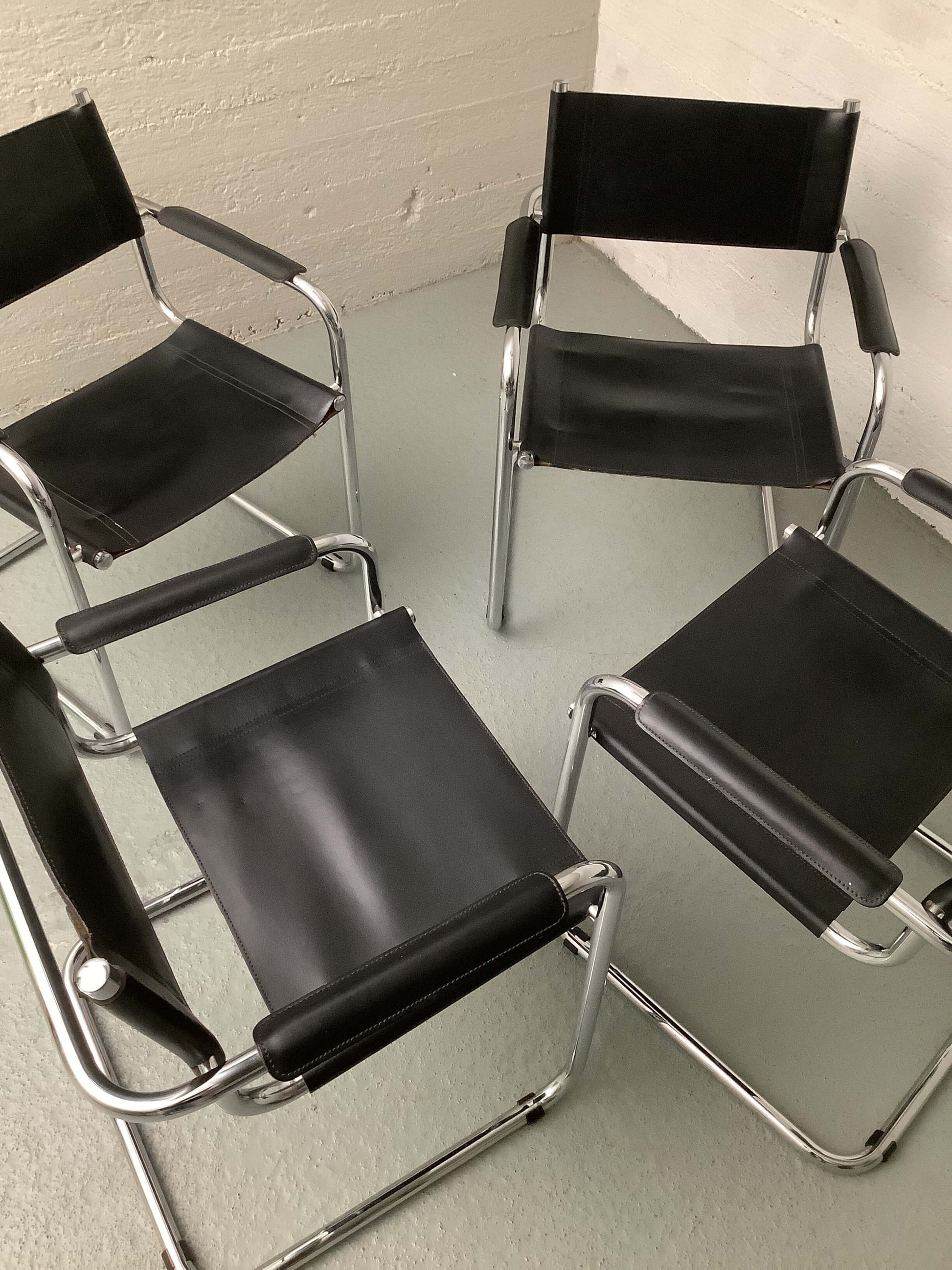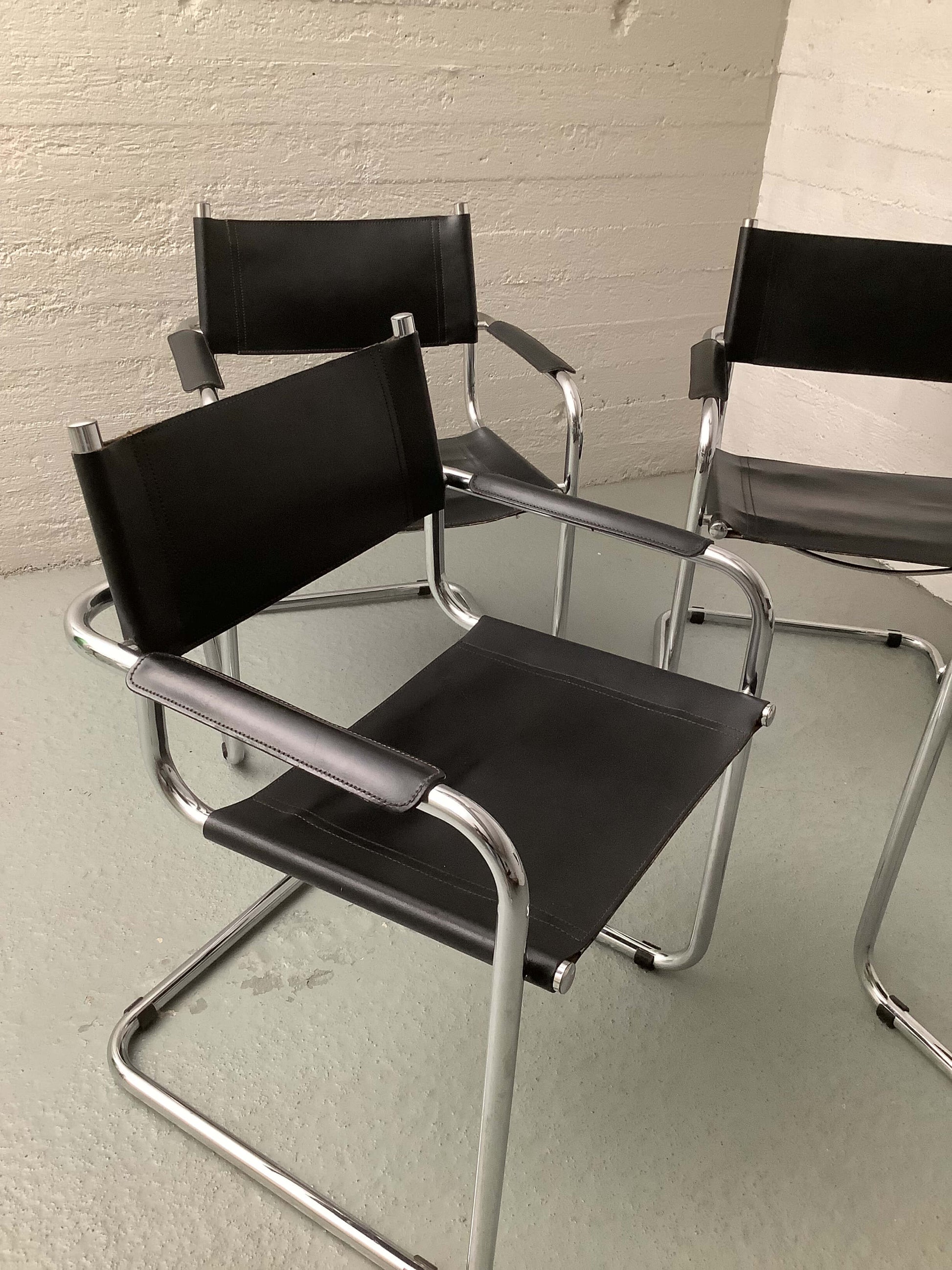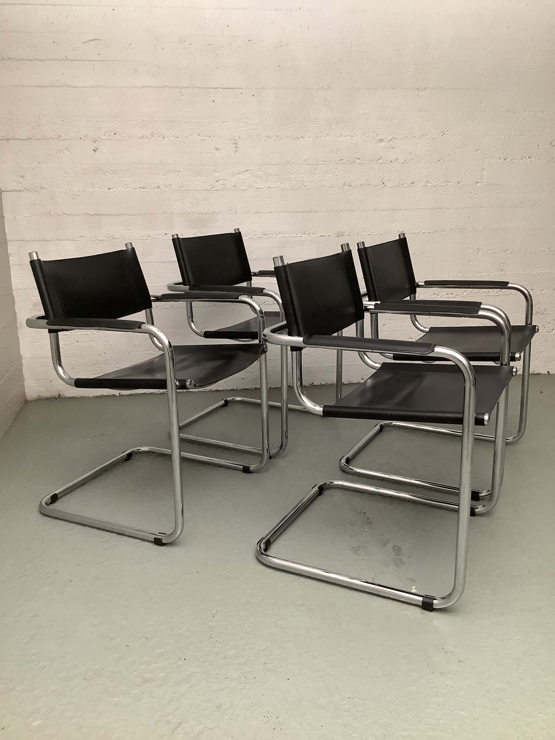 Mart Stam Cantilever tuolit 1986, 4kpl. Kromattu putkirunko, nahkaiset istuin ja selkänojat sekä käsinojat.