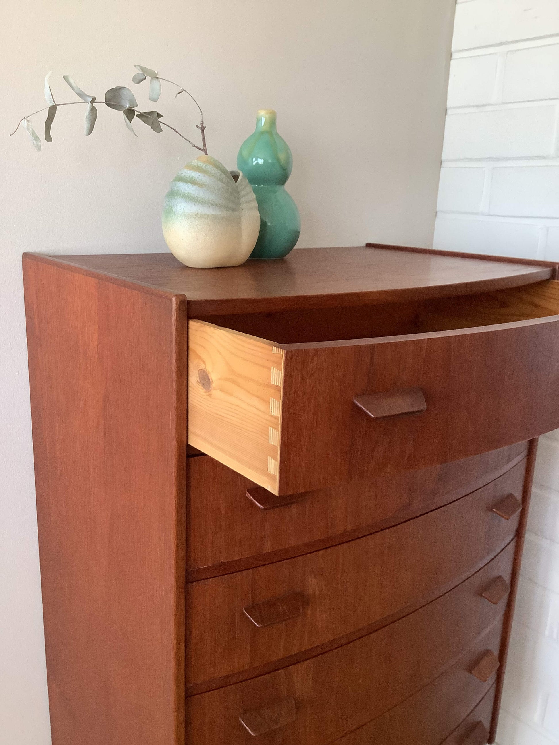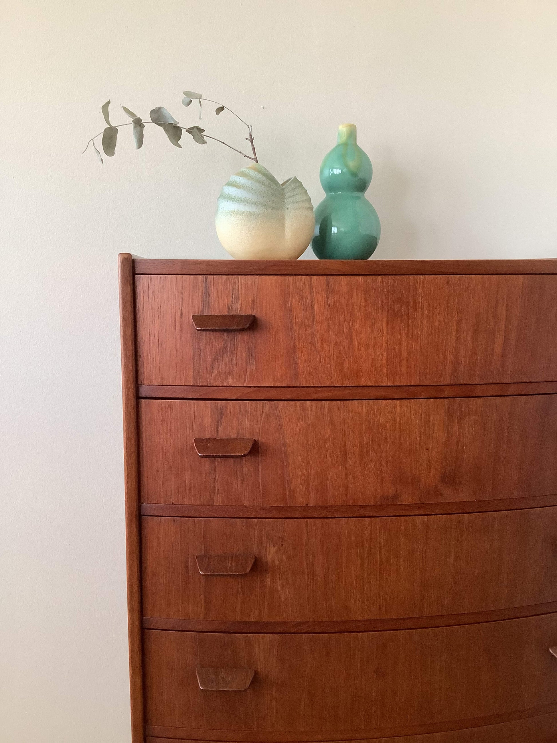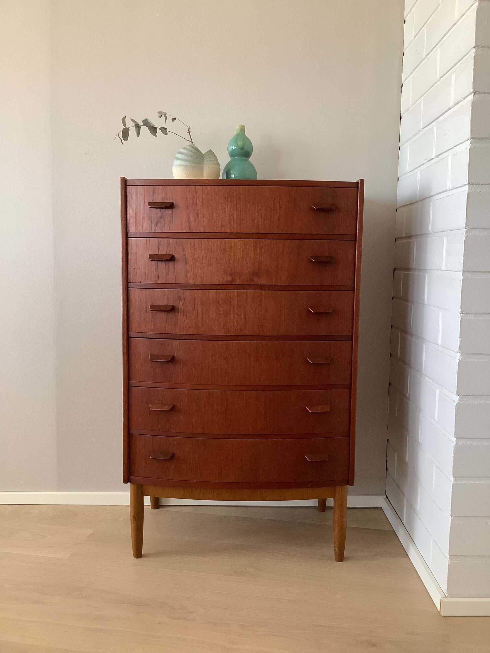 Tanskalainen Poul M. Volther teak-lipasto 50/60- luku. Upea, hieman harvinaisempi malli kaarevalla etuosalla.