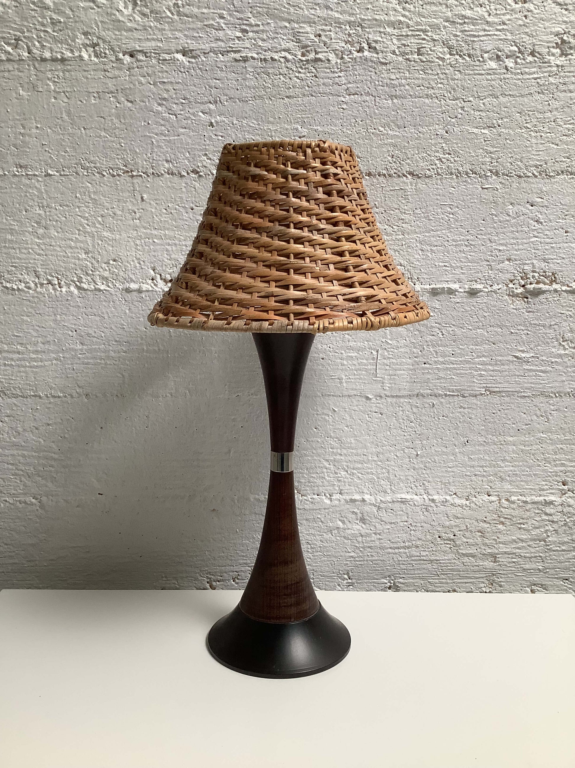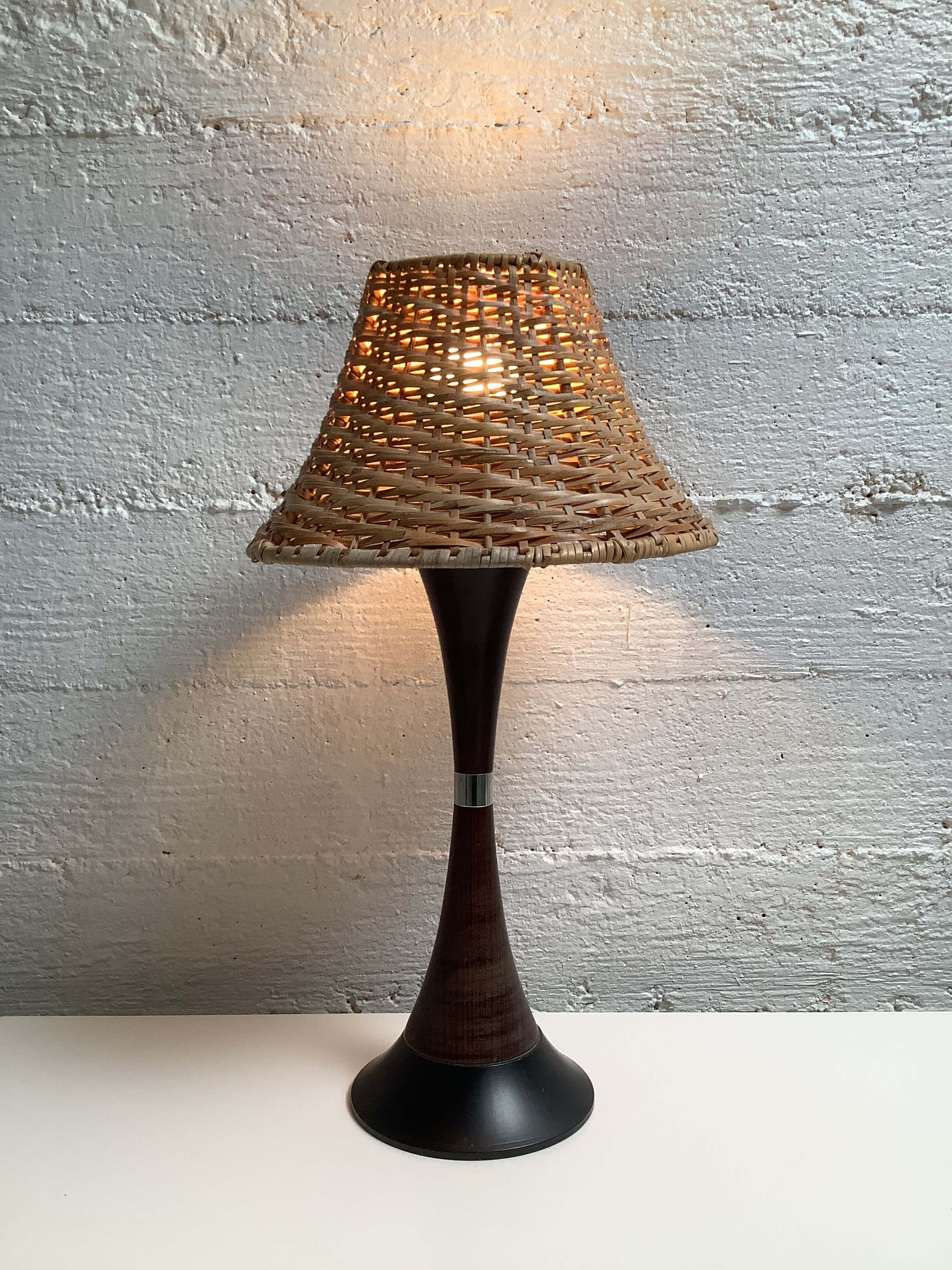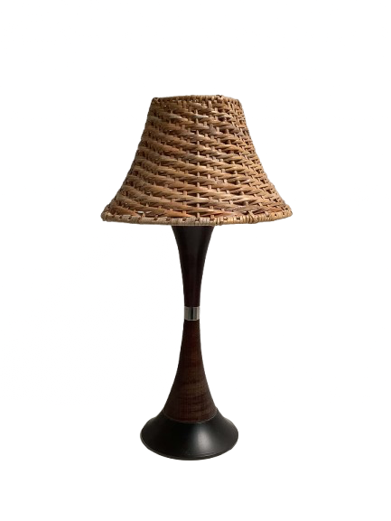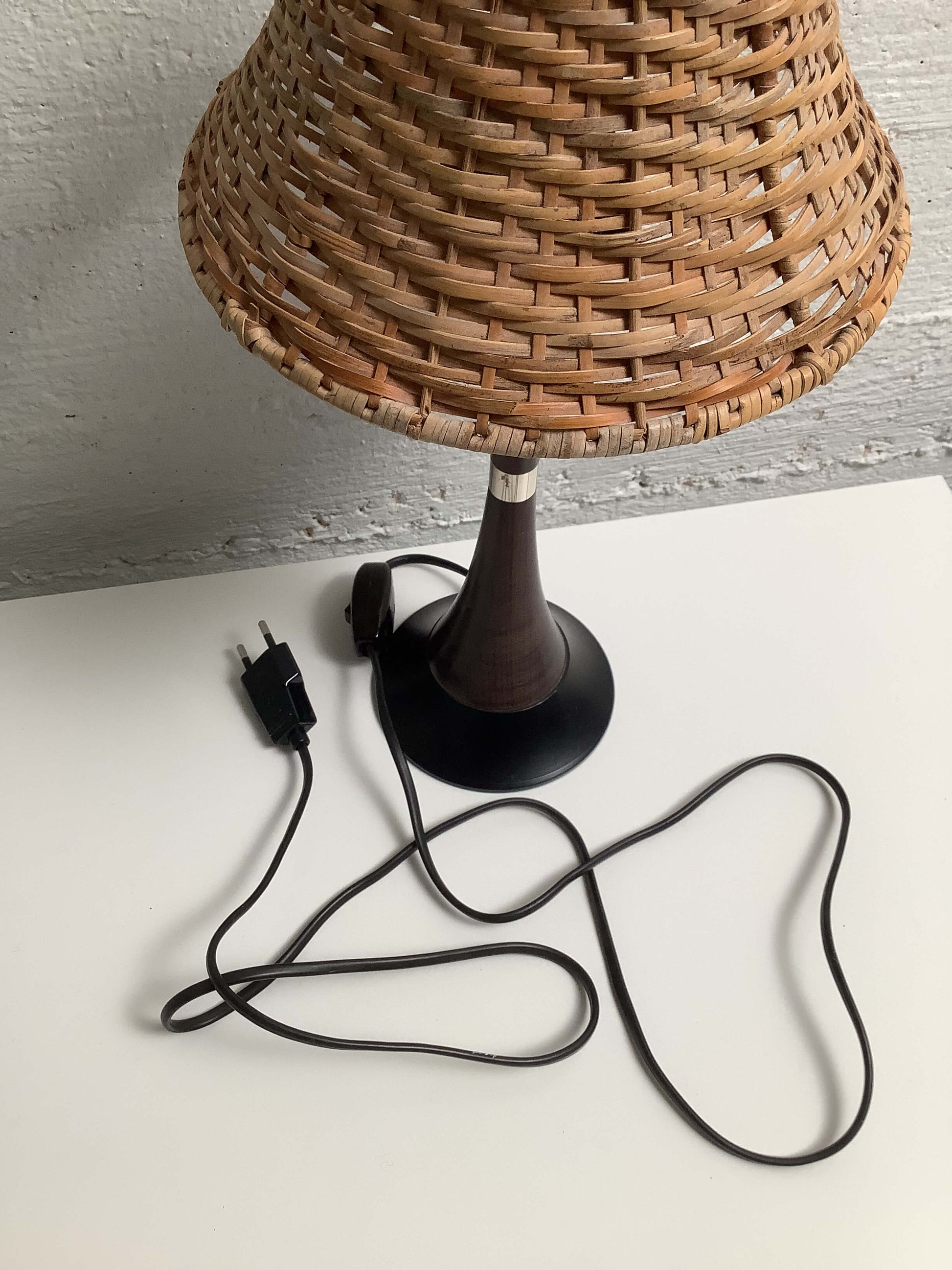 Kaunis pöytävalaisin. Varsi painava, metallia/puuta. Rottinkinen varjostin.