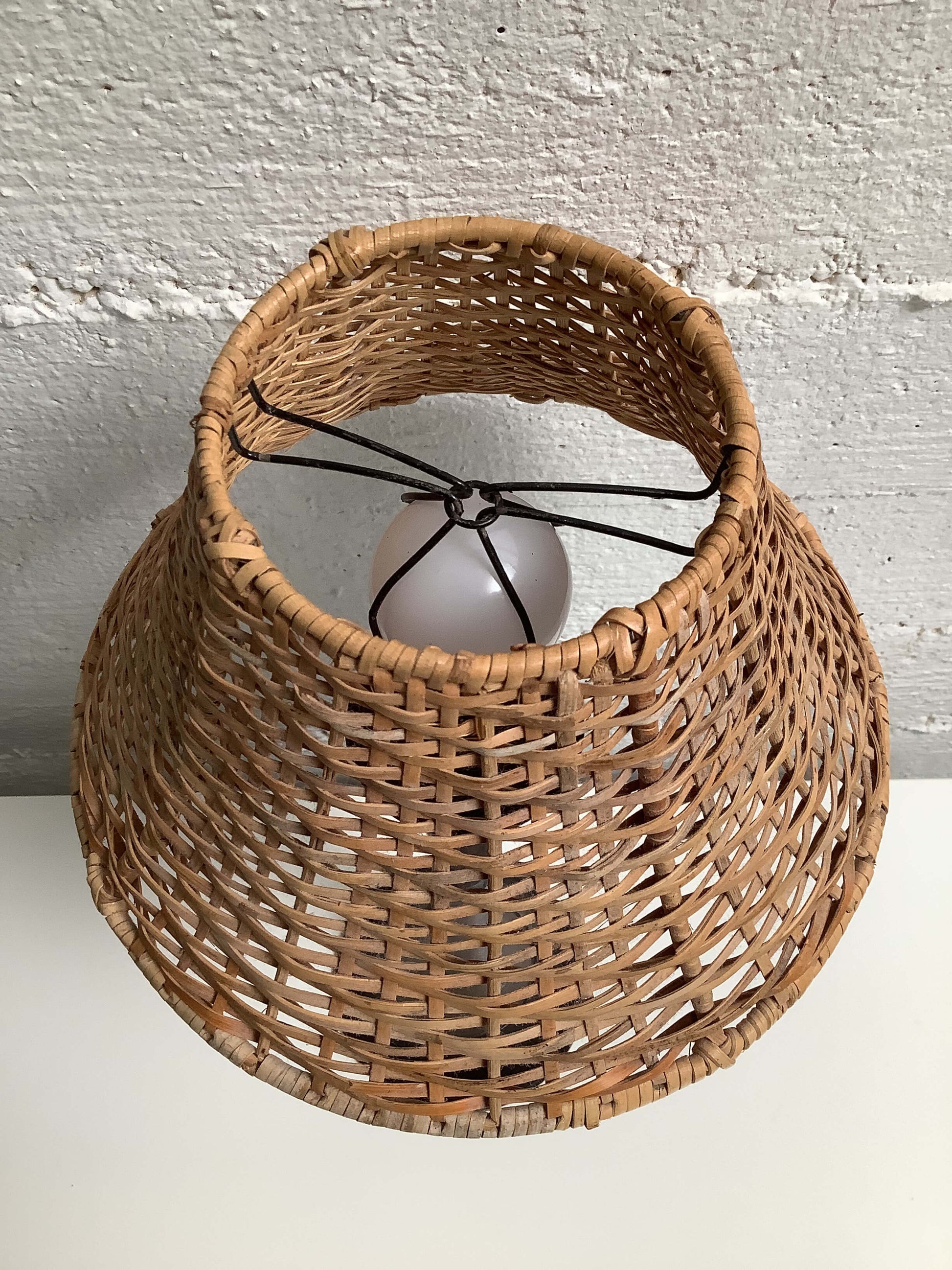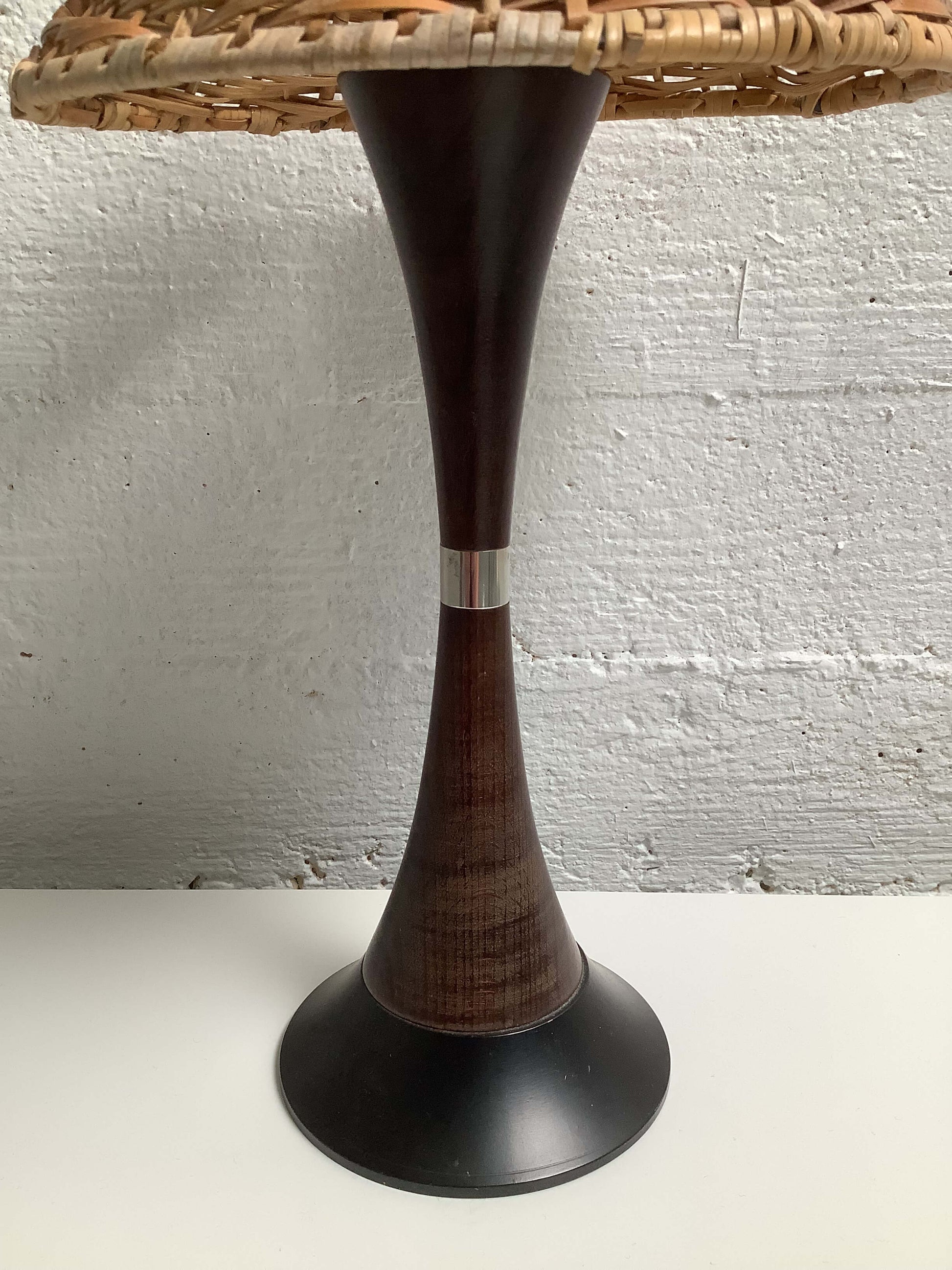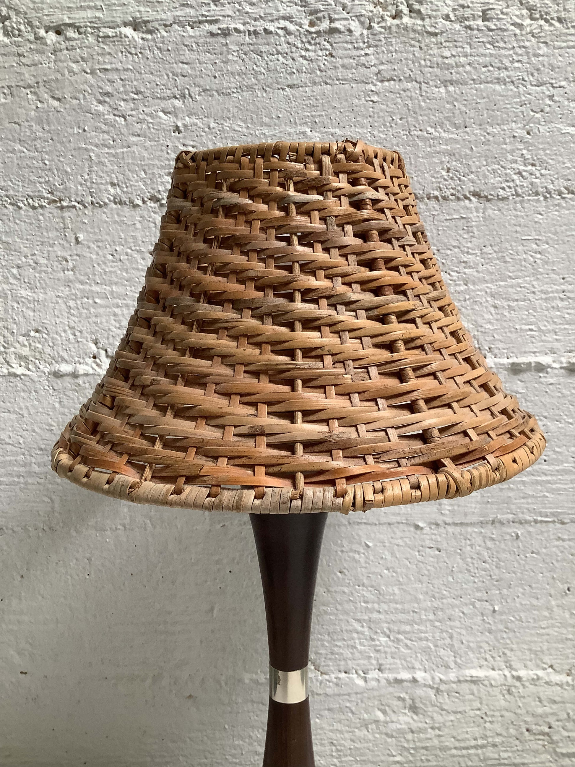 Kaunis pöytävalaisin. Varsi painava, metallia/puuta. Rottinkinen varjostin.