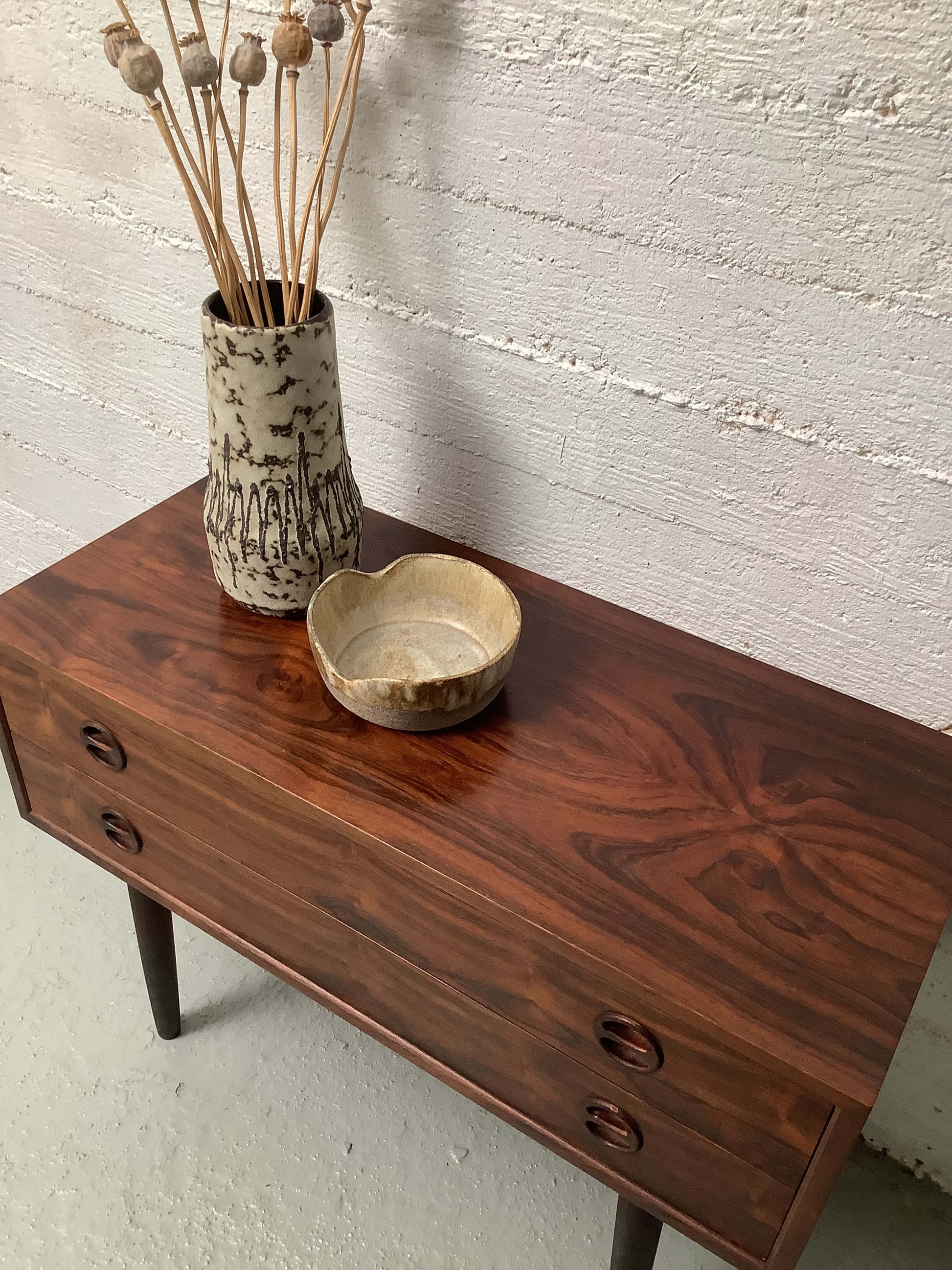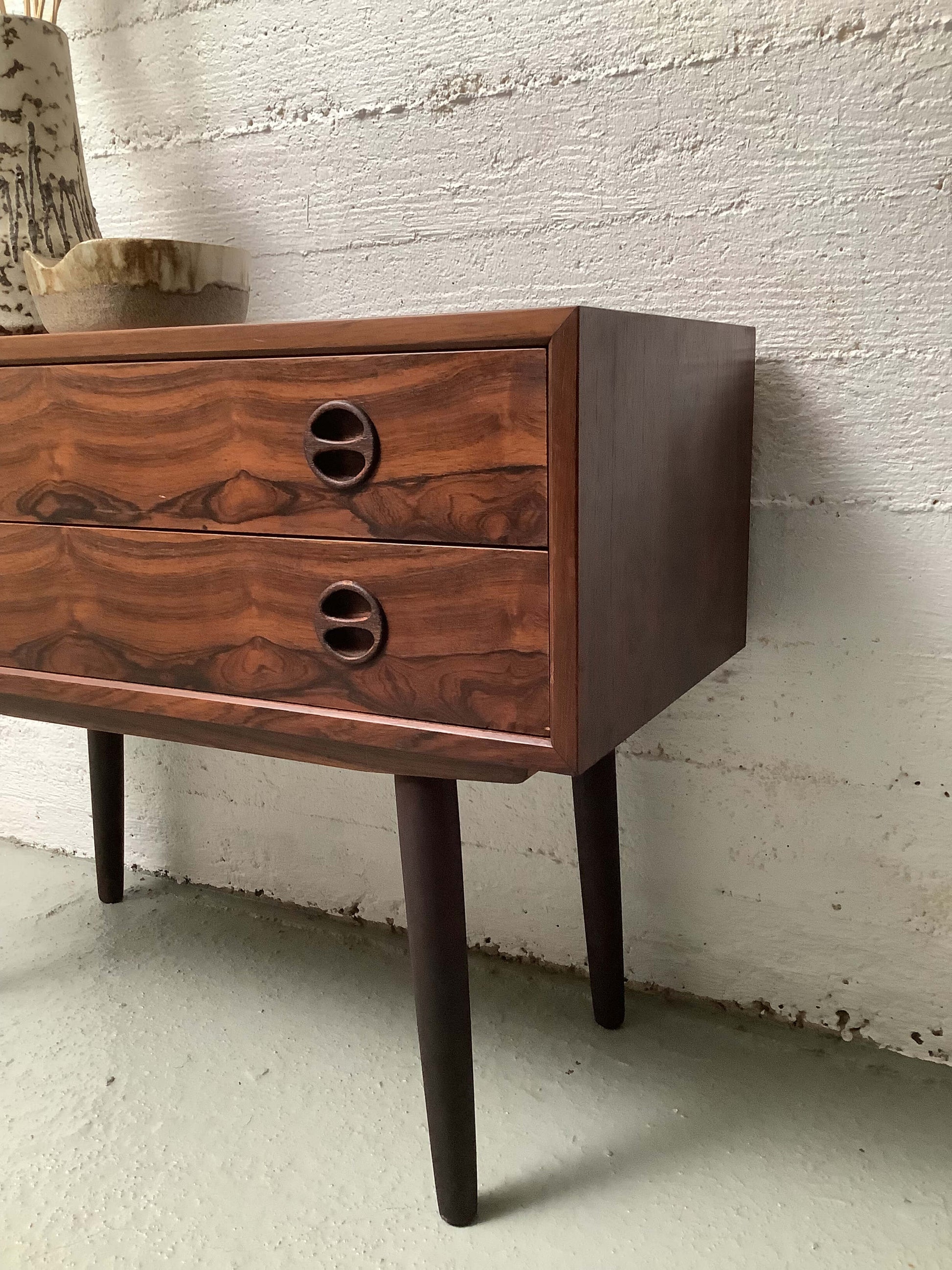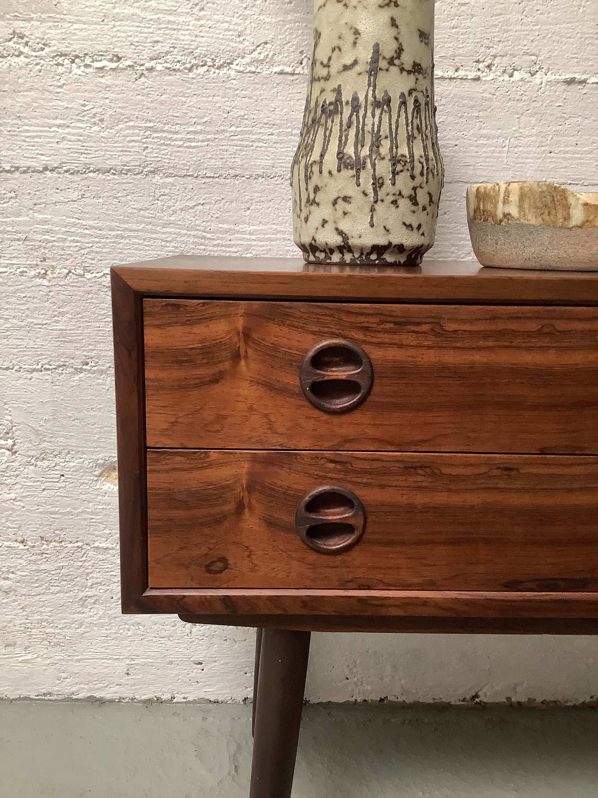 Kaunis ruusupuinen 60-luvun laatikosto. Persoonalliset pyöreät vetimet.
