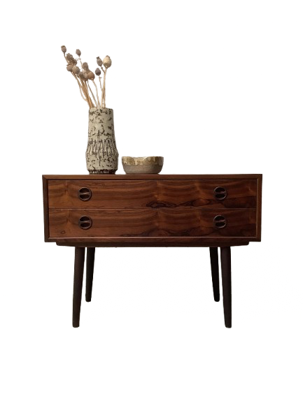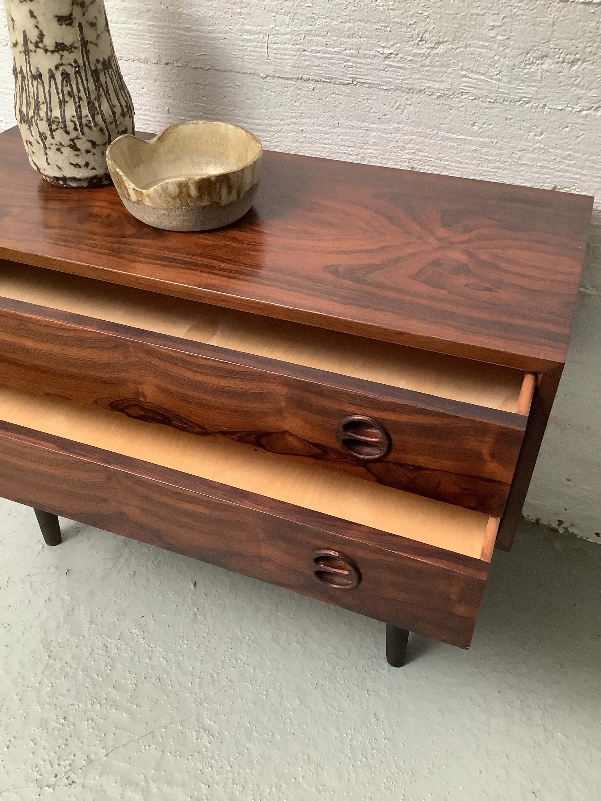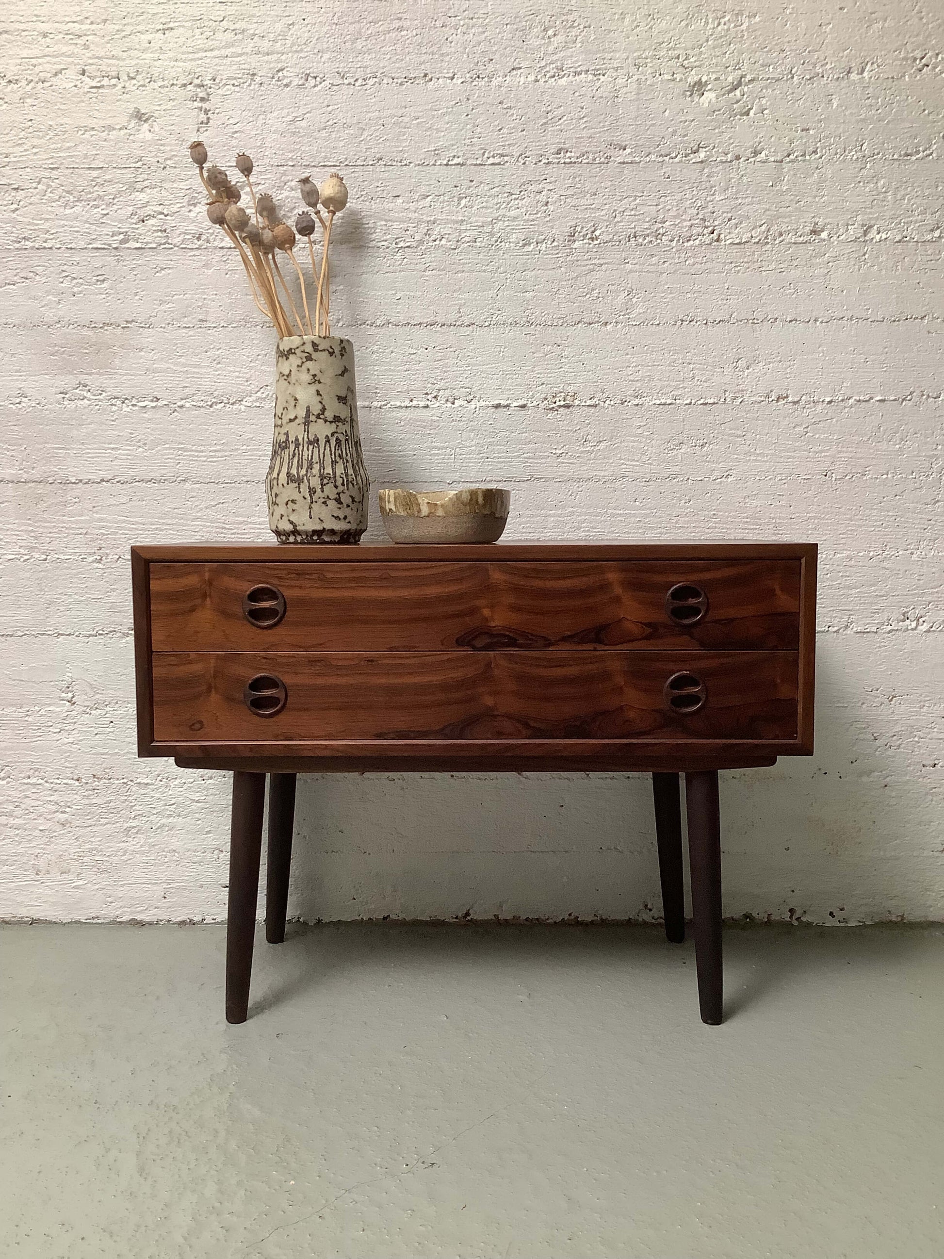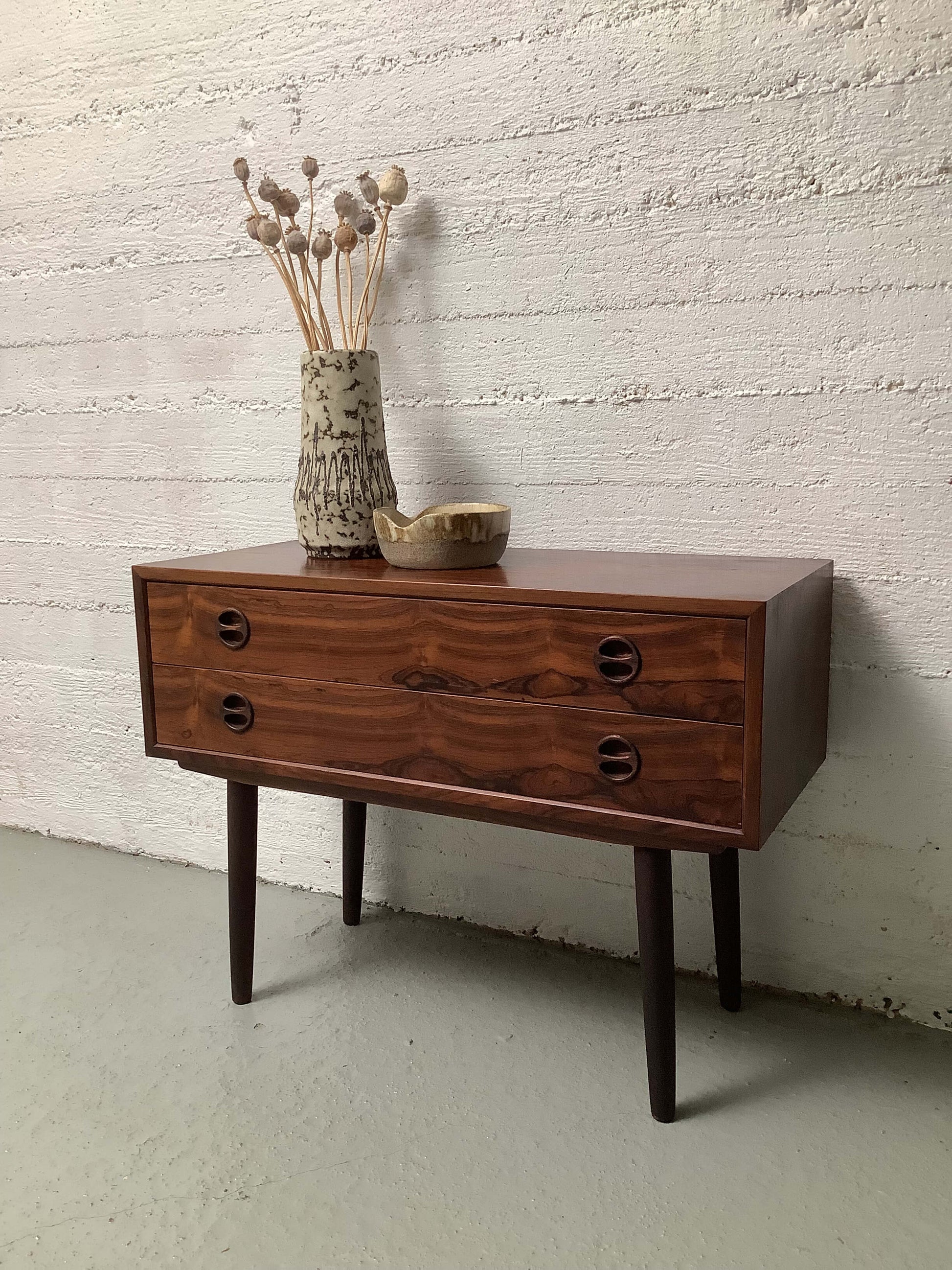 Kaunis ruusupuinen 60-luvun laatikosto. Persoonalliset pyöreät vetimet.