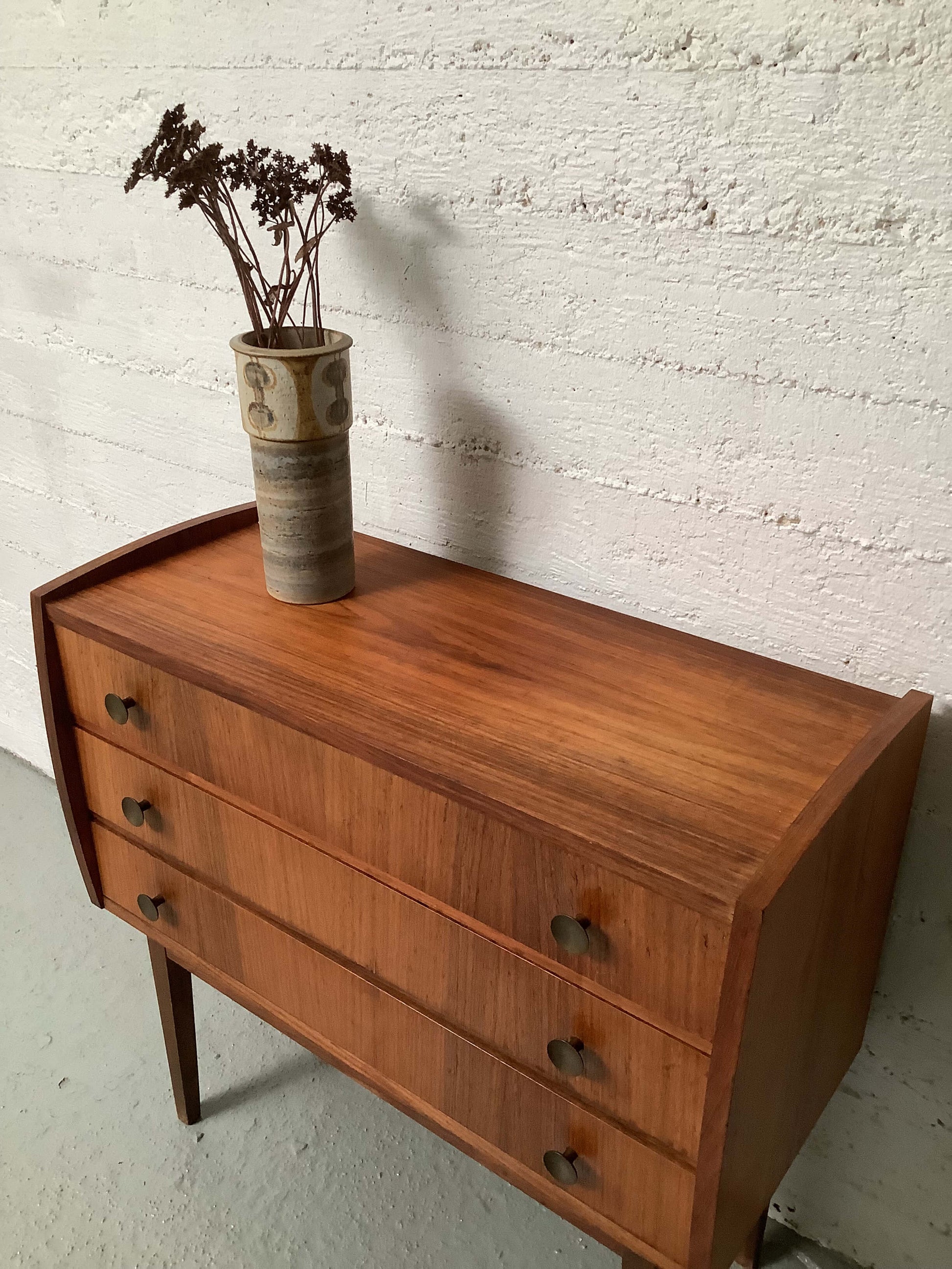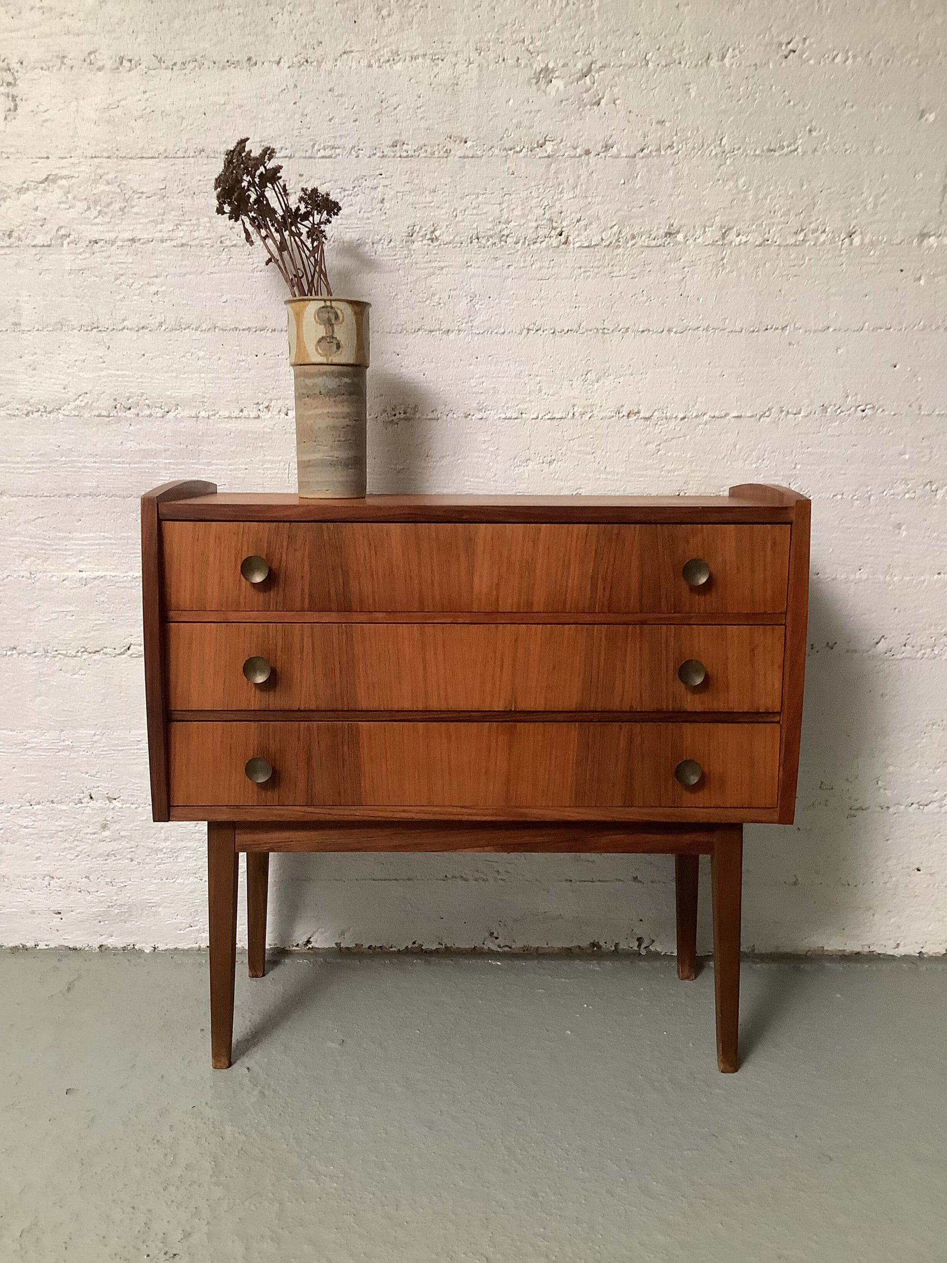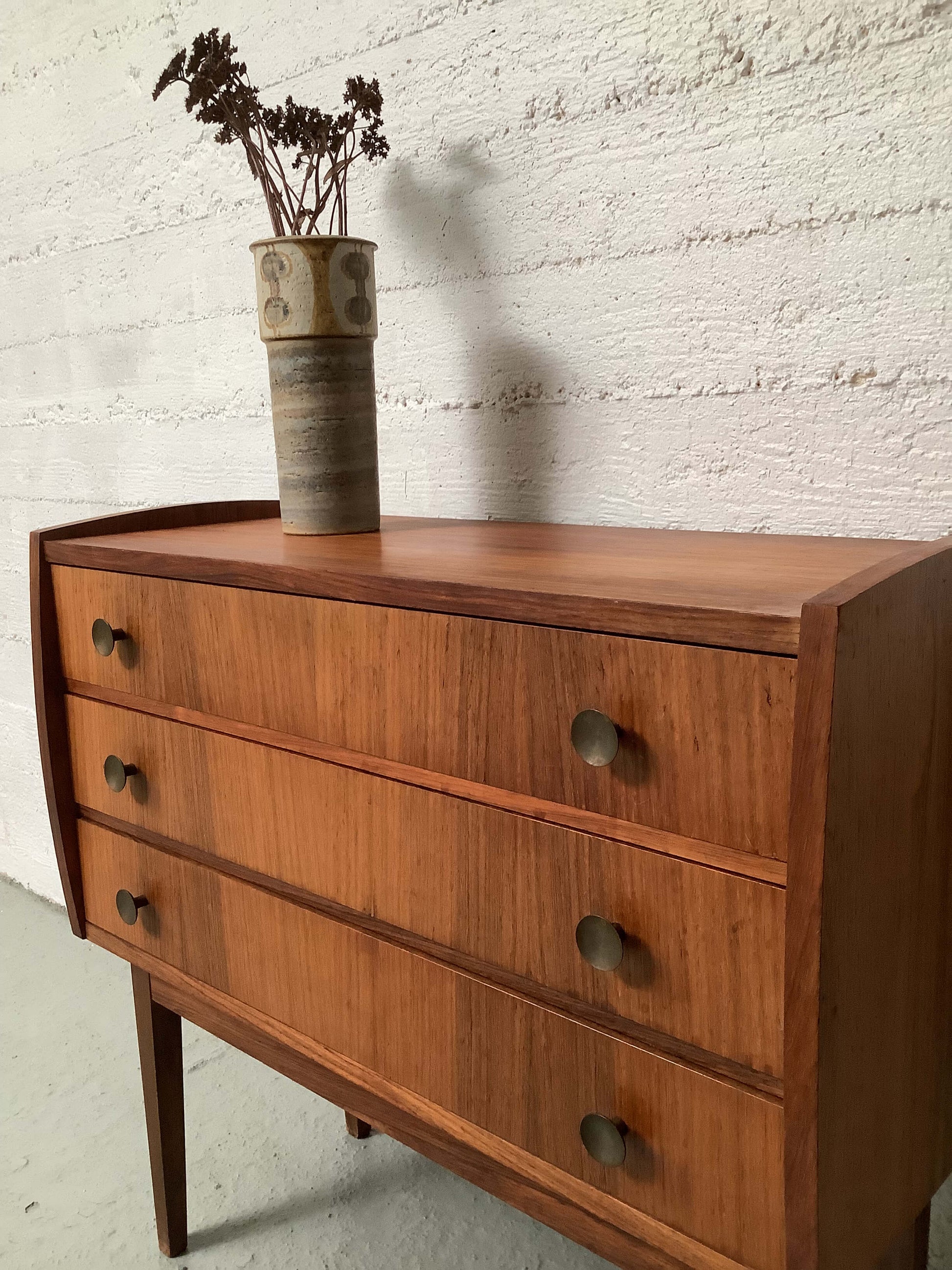 Tanskalainen teak-laatikosto 60-luku. Kauniit pyöristetyt messinkivetimet.