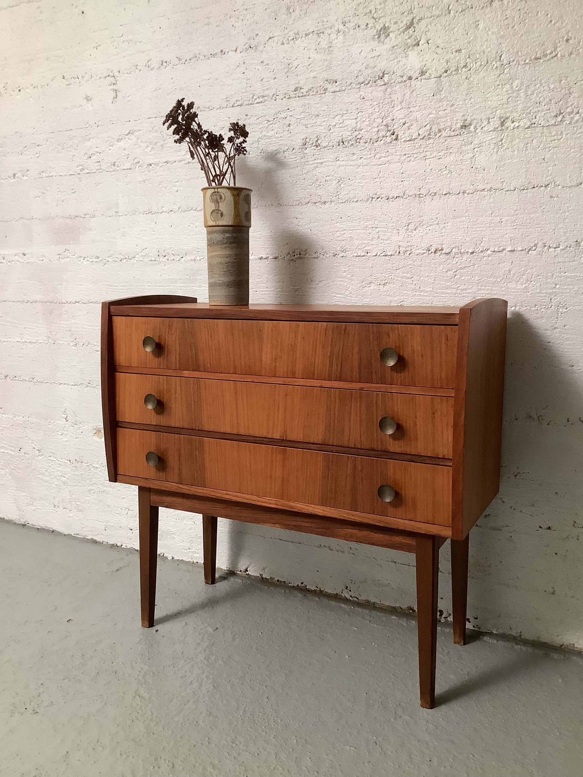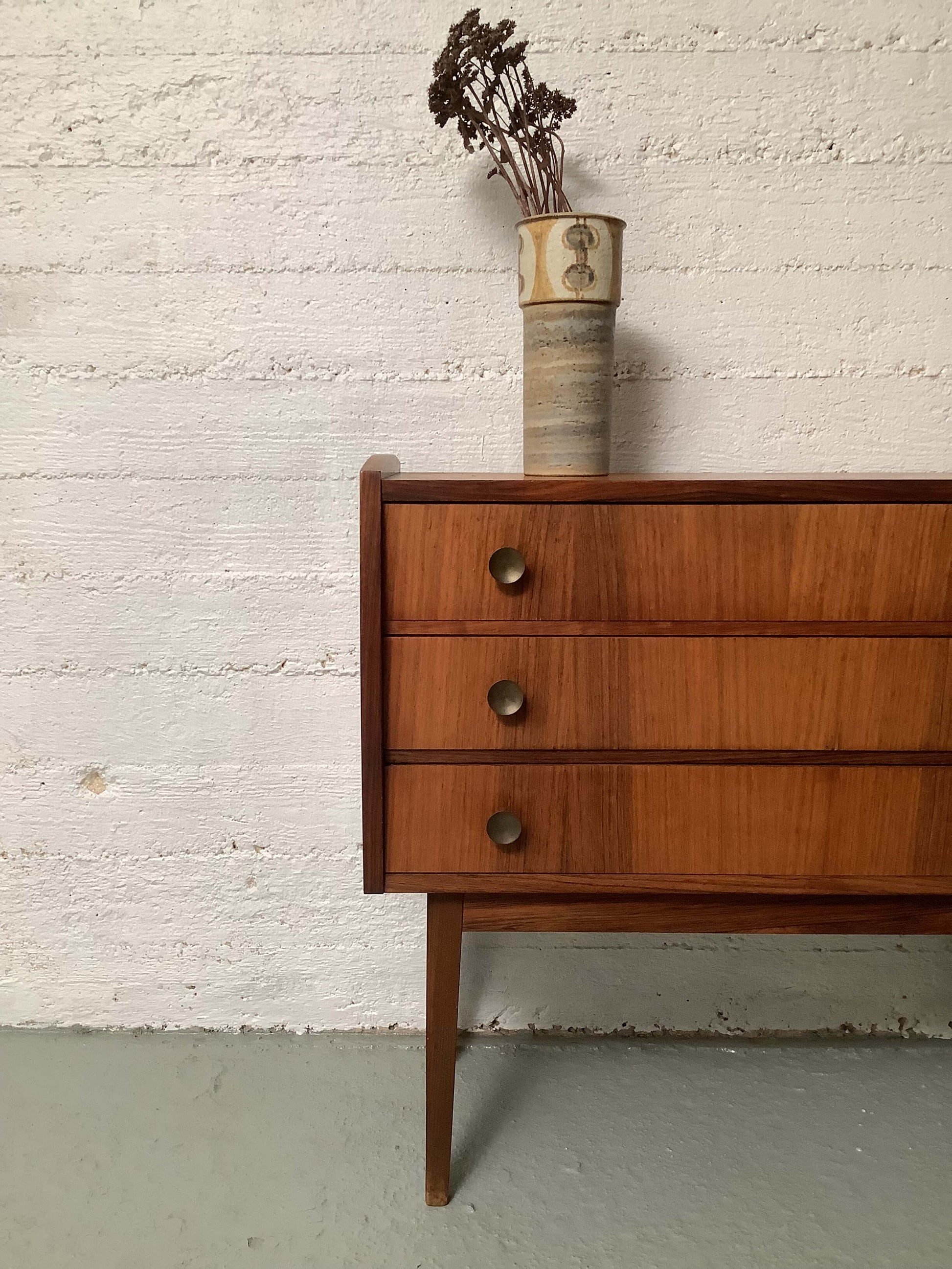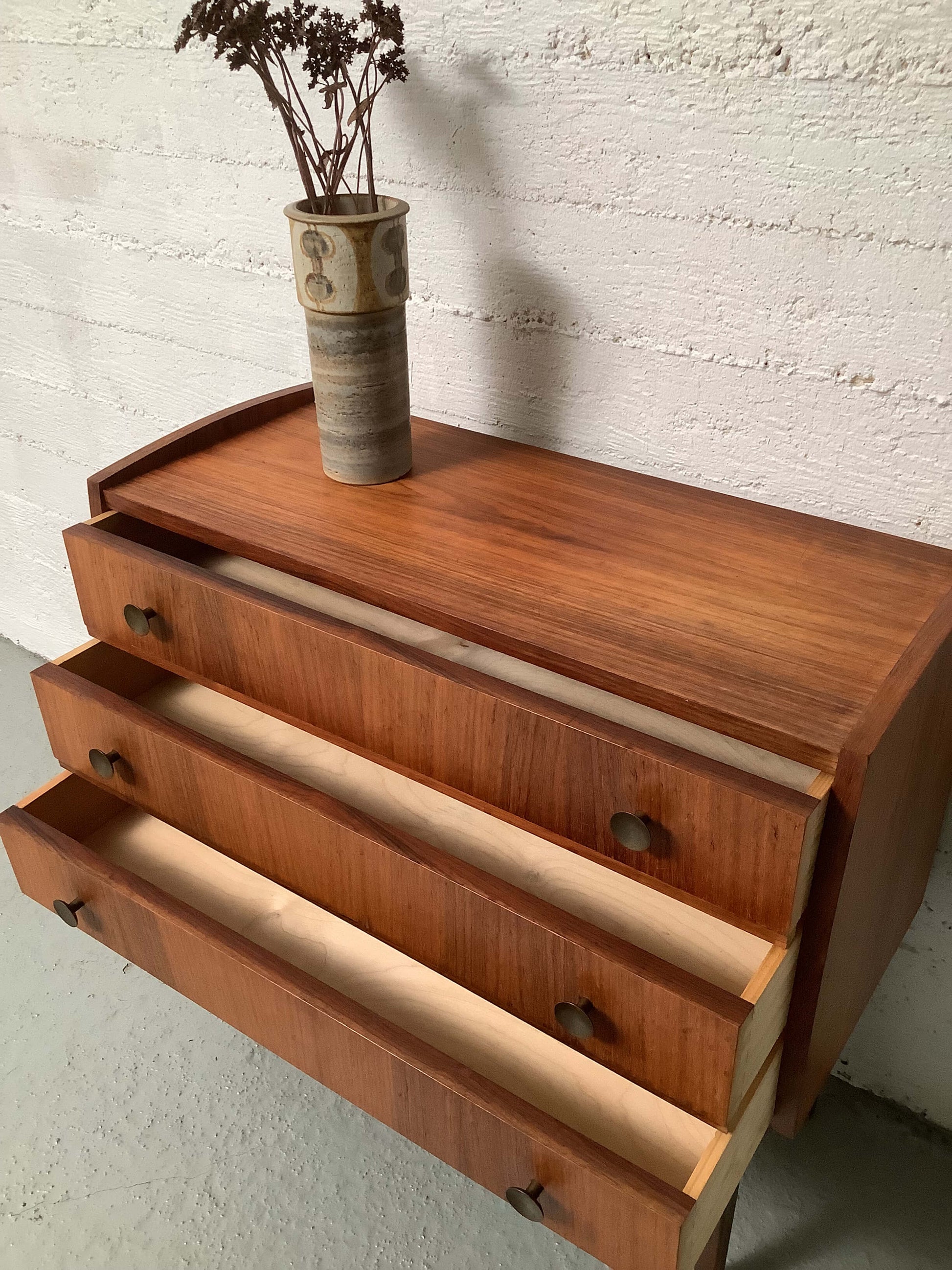 Tanskalainen teak-laatikosto 60-luku. Kauniit pyöristetyt messinkivetimet.
