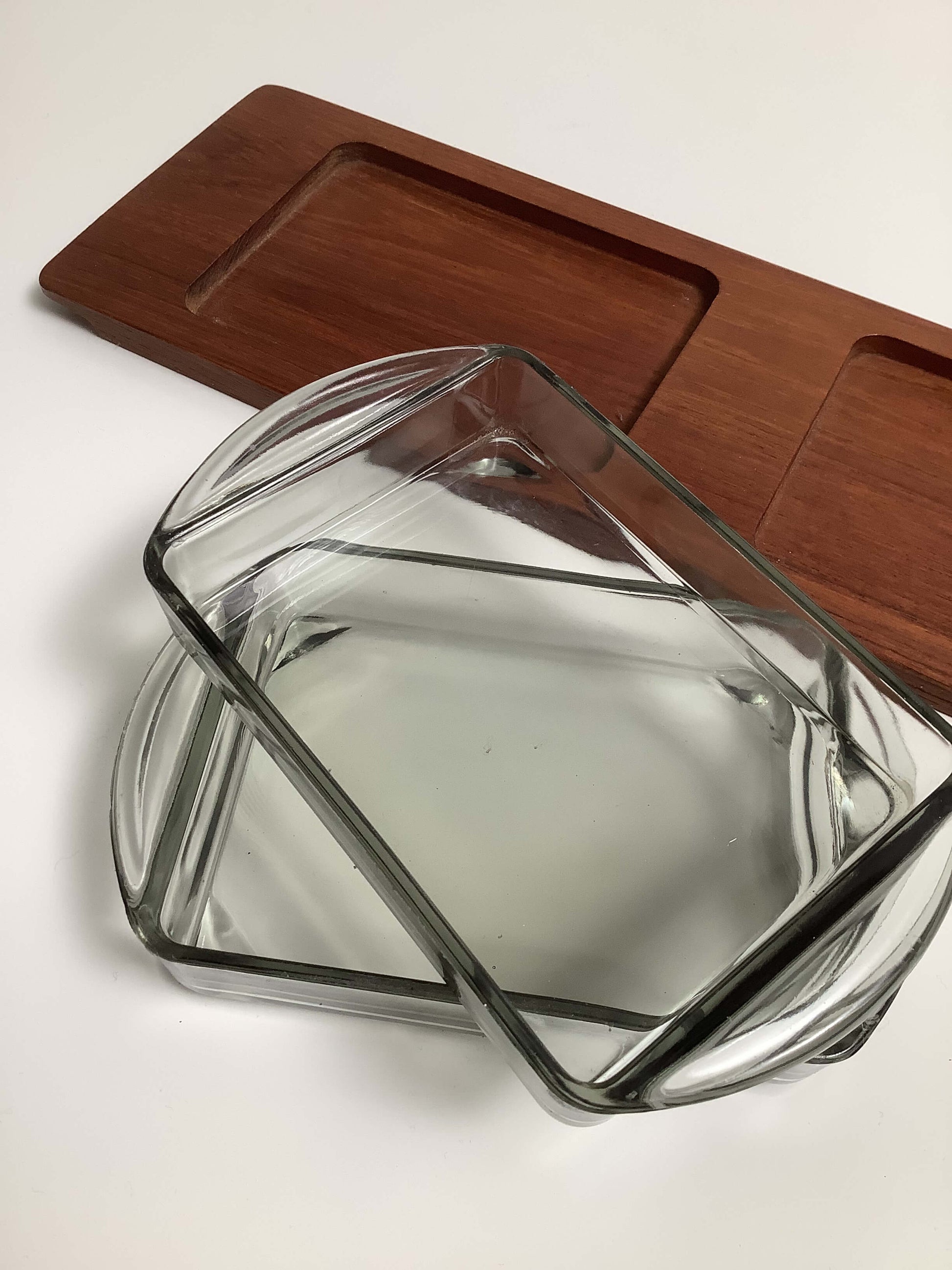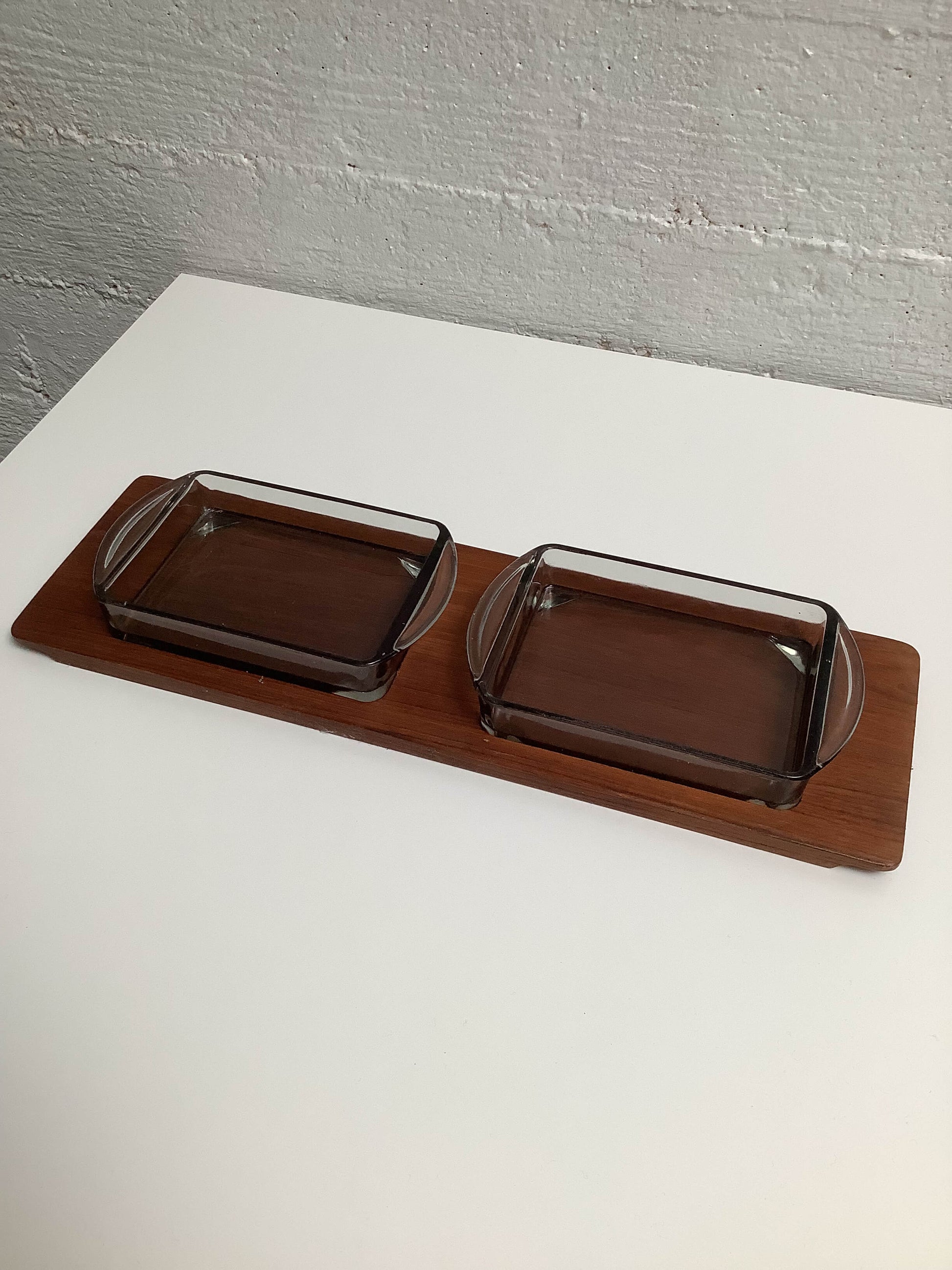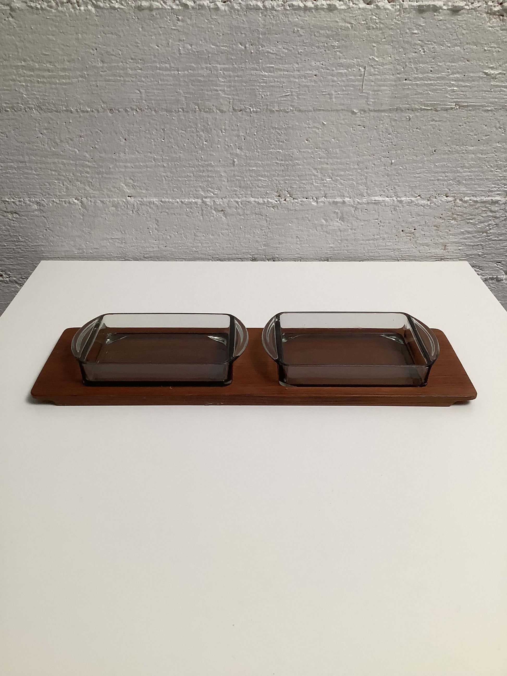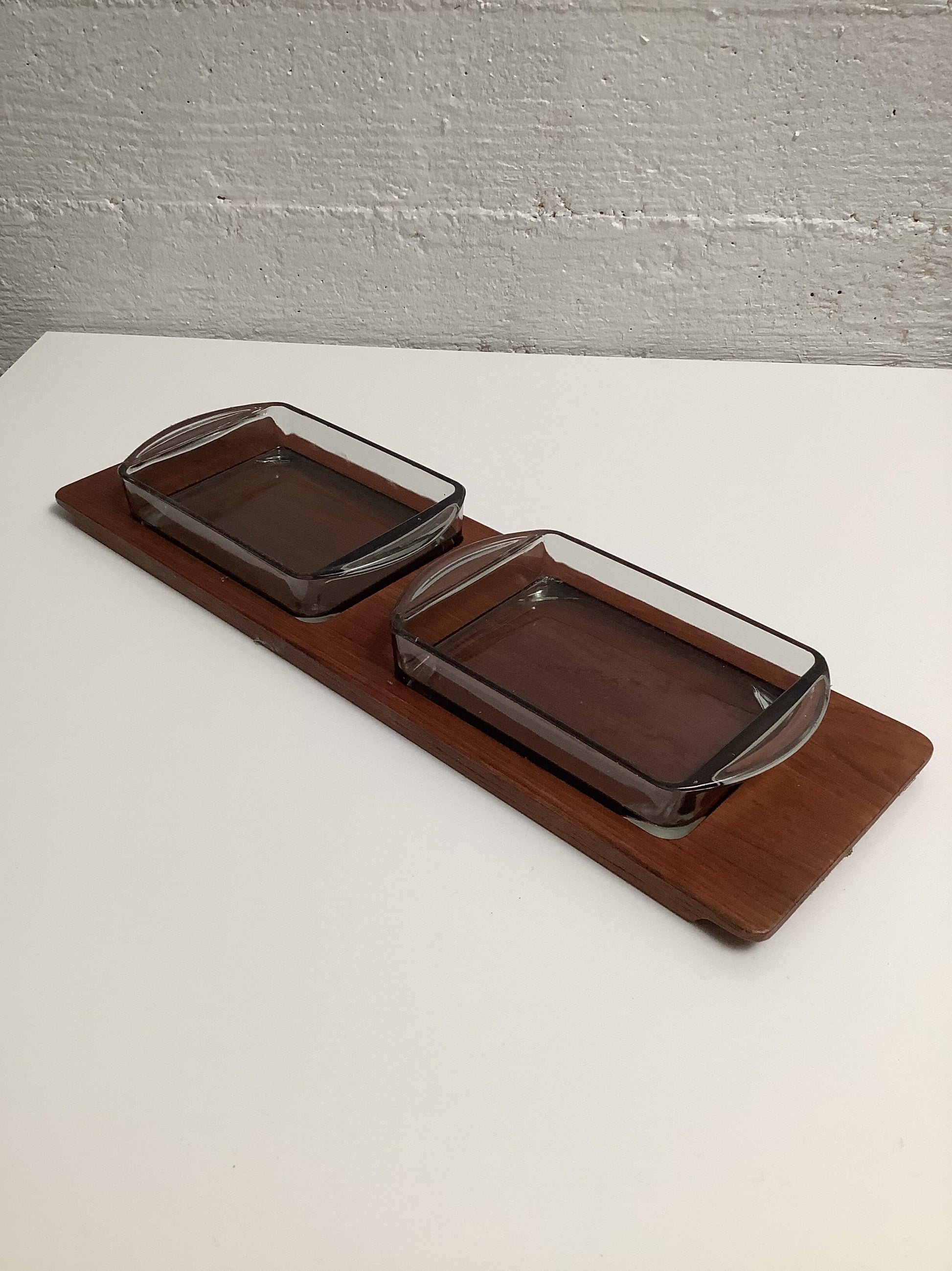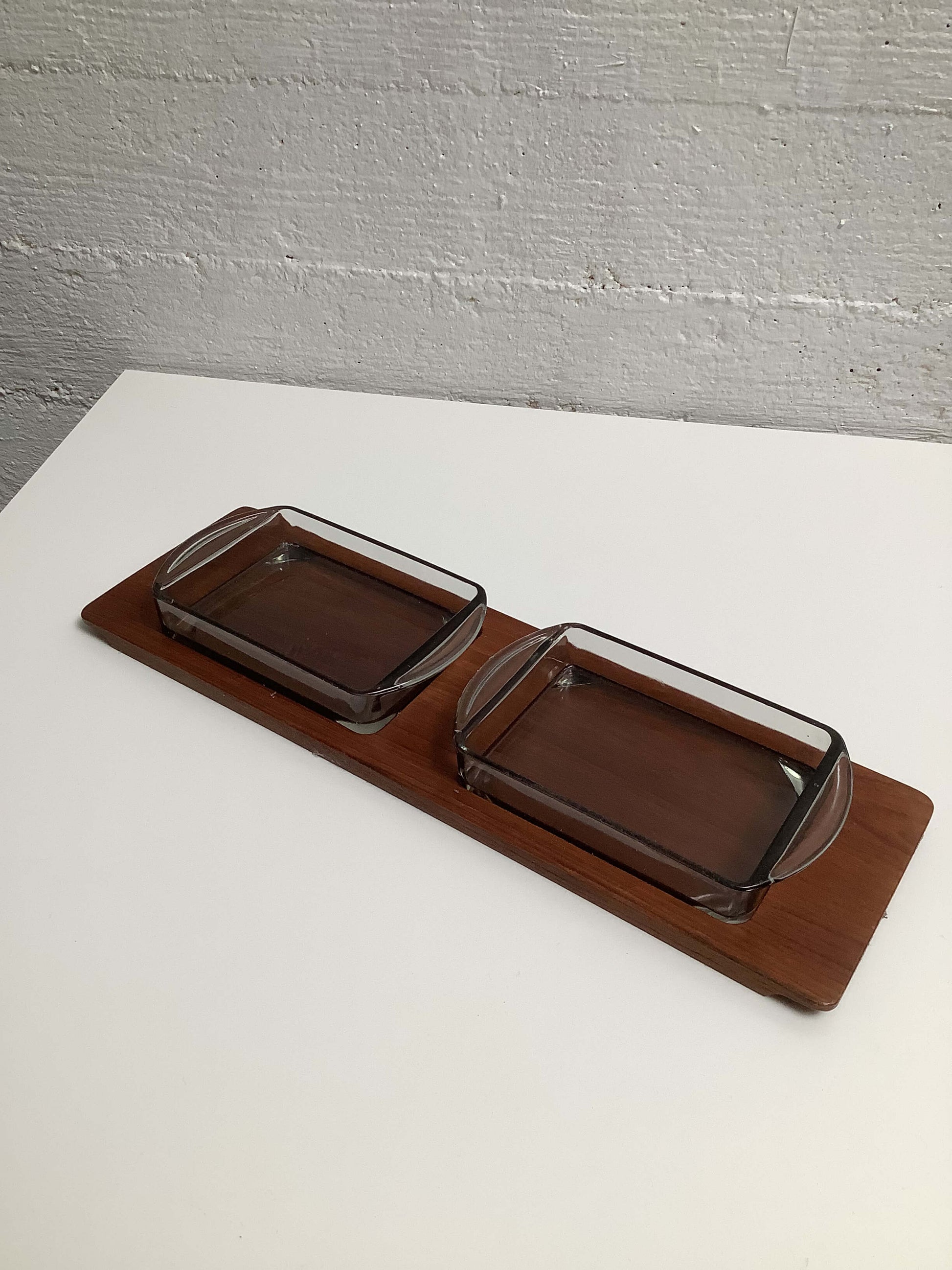 Tanskalainen teak-tarjoiluastia, kahdella lasikulholla.